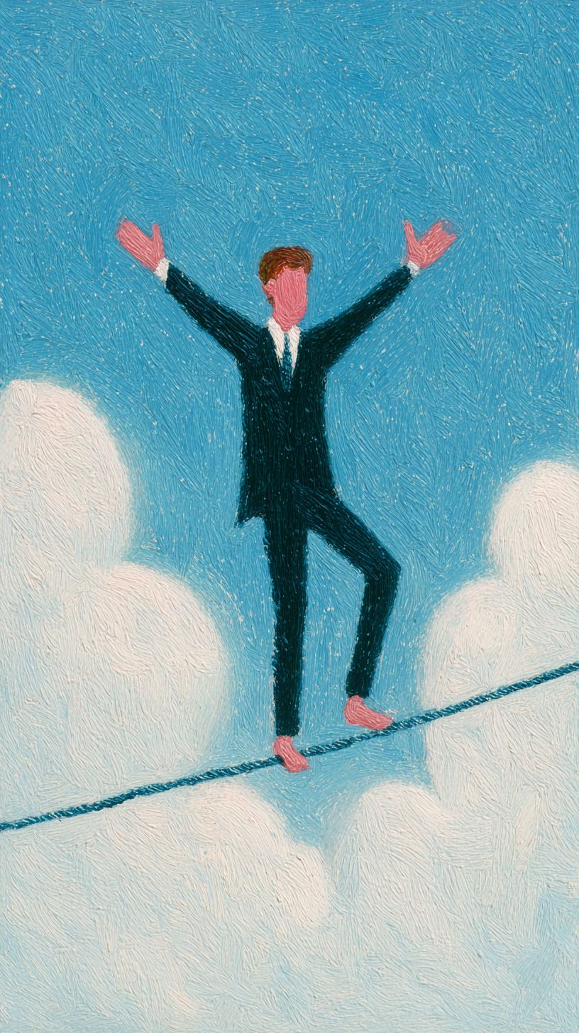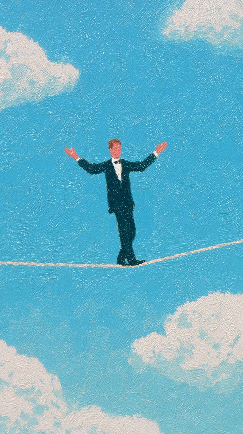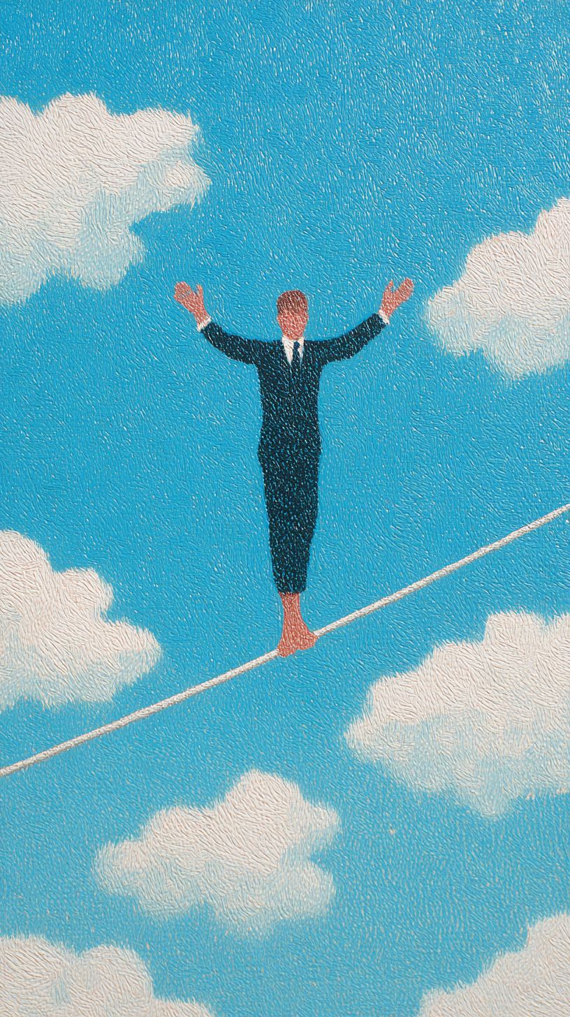 在蓝天和蓬松白云的背景下,一位身穿黑色西装的男子伸展双臂以保持平衡,走在细绳上。这传达了一种冒险、挑战和平衡控制的视觉冲击,使用了乔安·科尔内利亚的油画技法,具有极简主义风格。