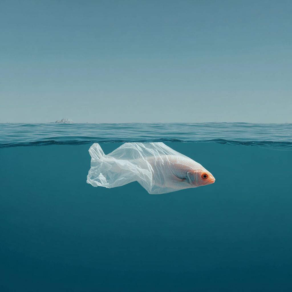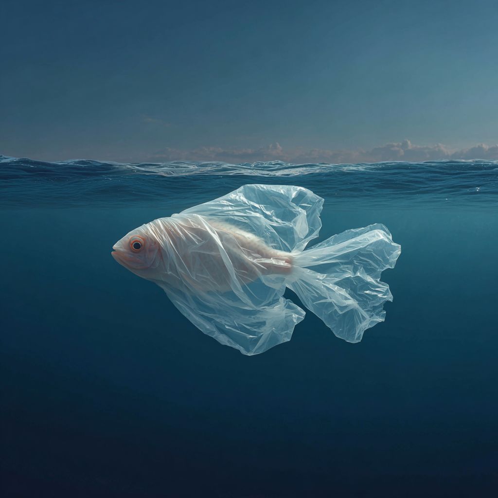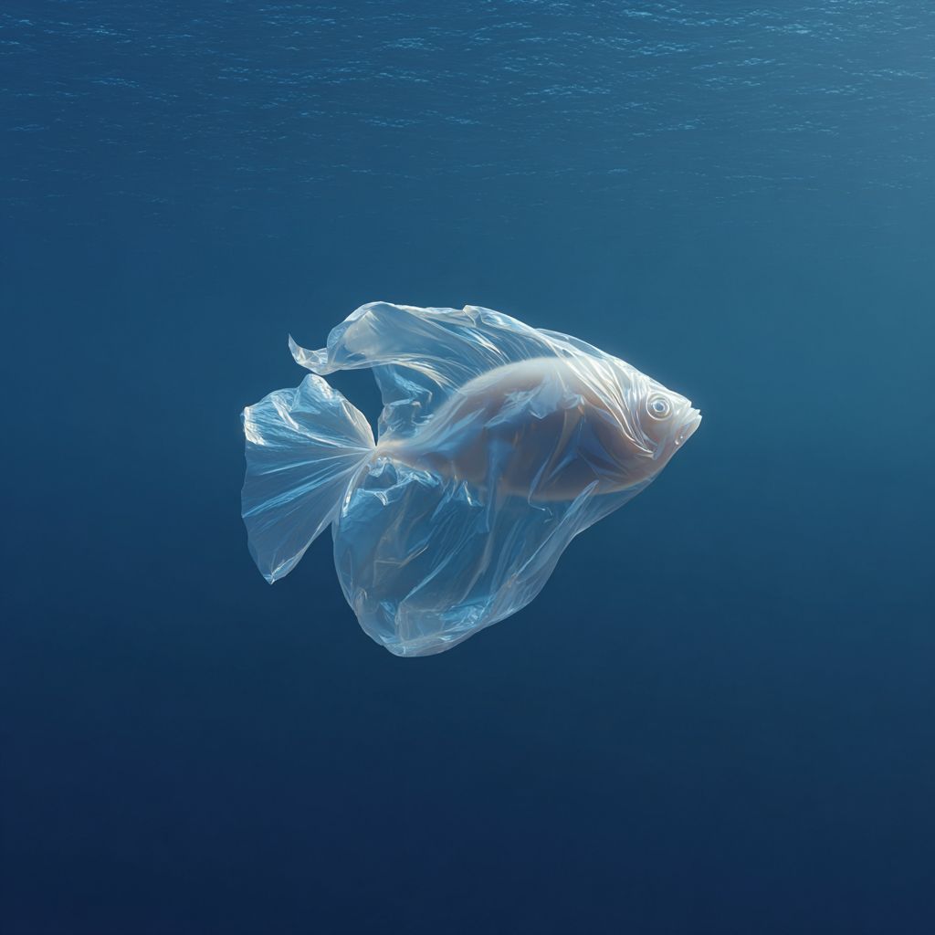 A plastic bag shaped like a fish, floating in the ocean --profile z81bx6f --v 7.0