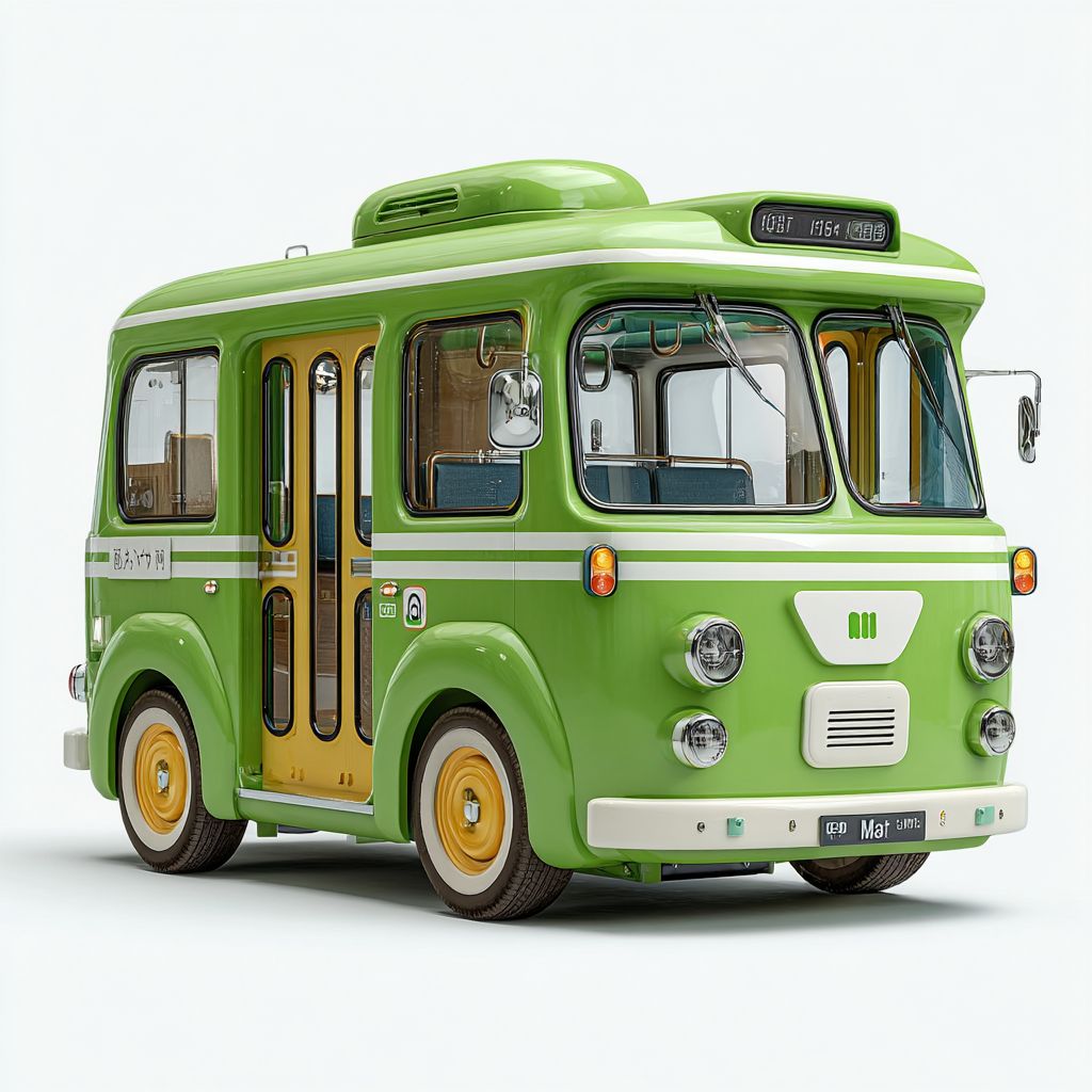 POP Mart style, A modern new energy bus (white green stripe), Rectangular shape, Solid color background, White background, The shape is simple, Render, 3D --stylize 750