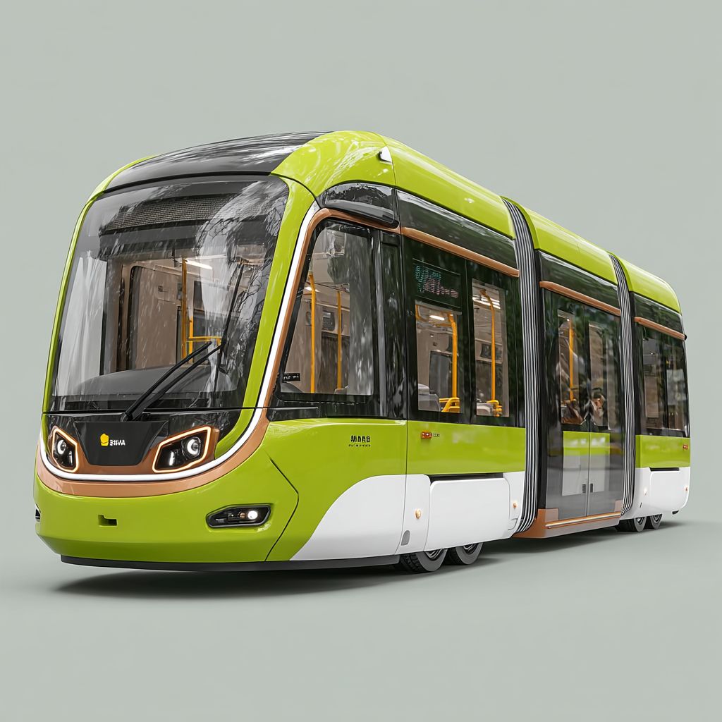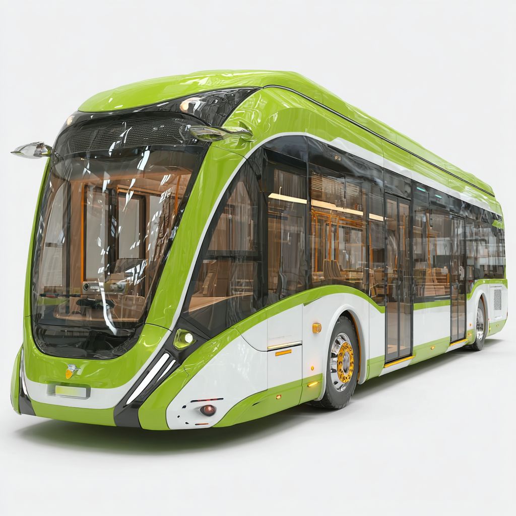 POP Mart 风格,一辆现代新能源公交车(白绿条纹),矩形形状,单色背景,白色背景,形状简单,渲染,3D