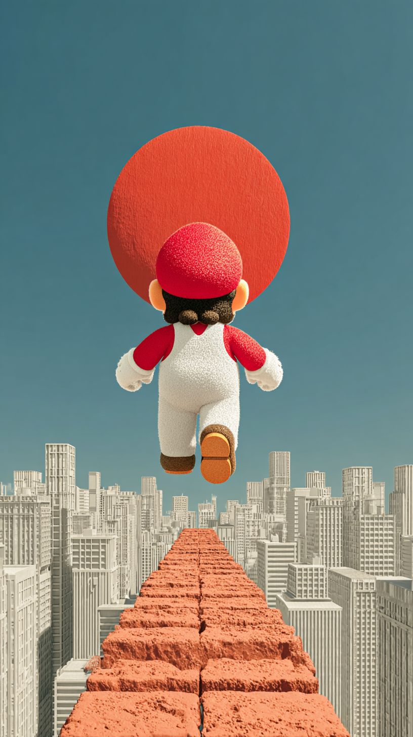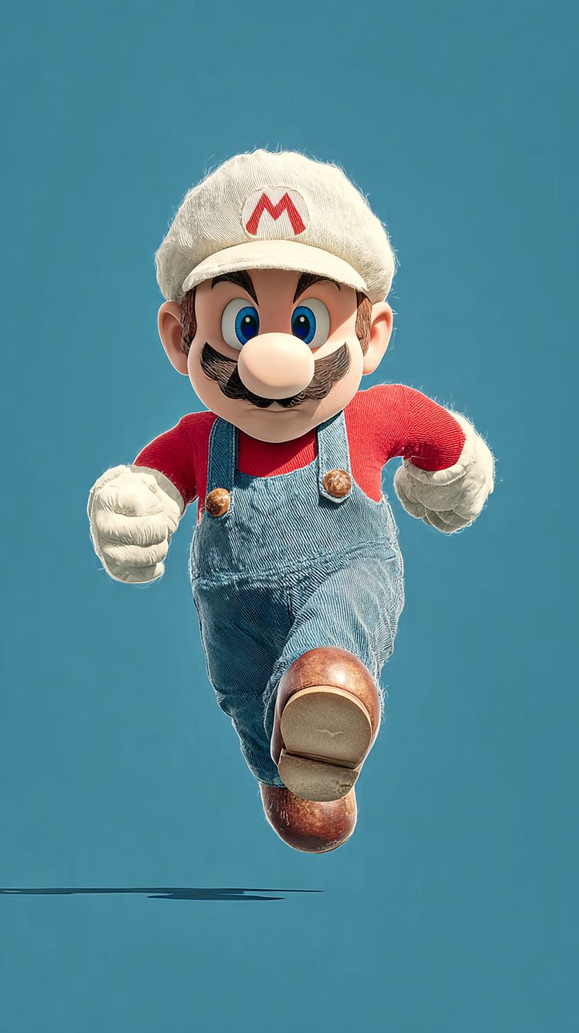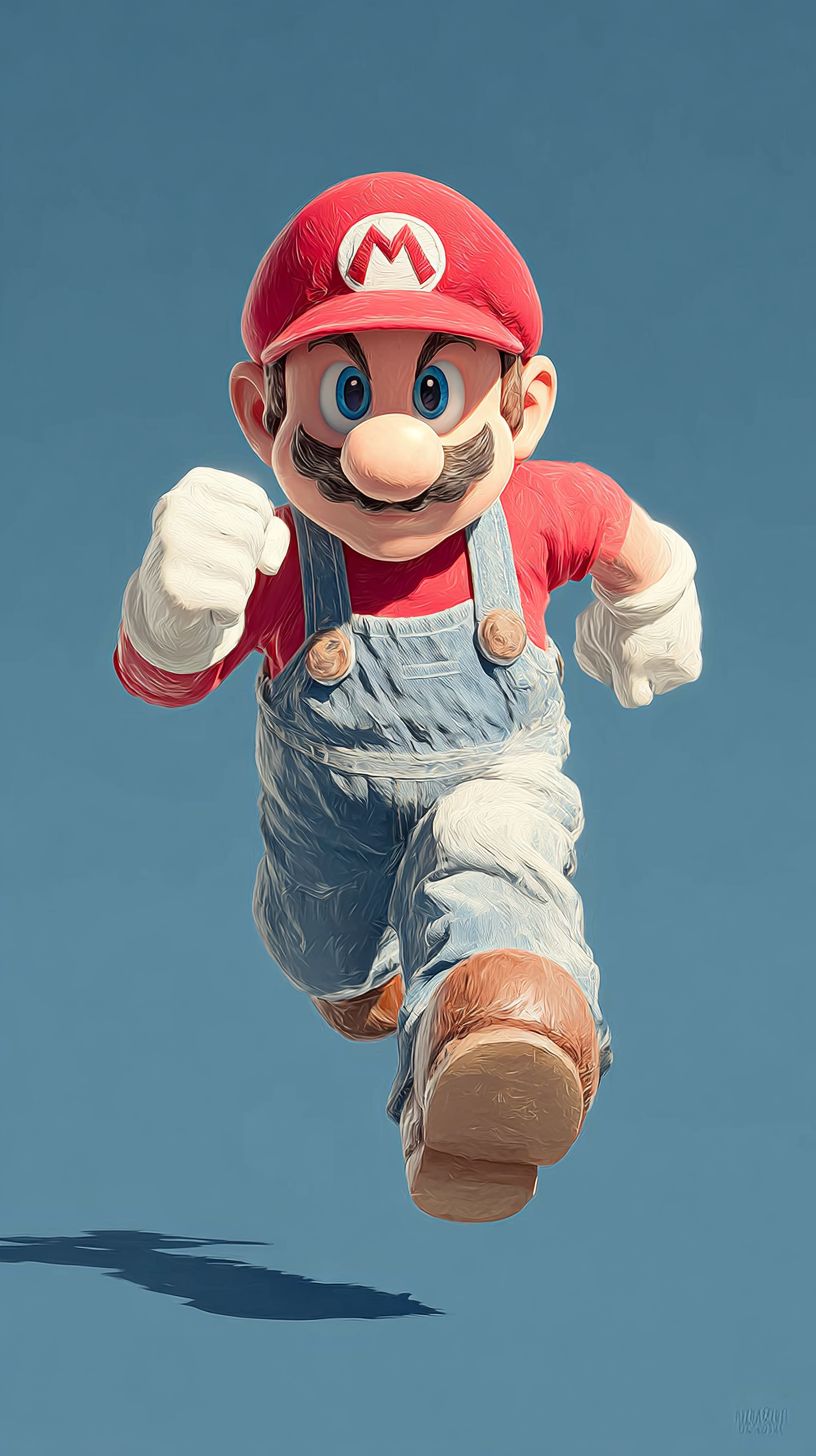 一个扁平设计的插图,描绘了马里奥跳起的动态,呈现出正面、简约的风格。背景是纯天蓝色,艺术作品采用柔和的、自然的砖红色和牛仔蓝色调,形状干净,间距均衡,展现出简单的几何魅力。