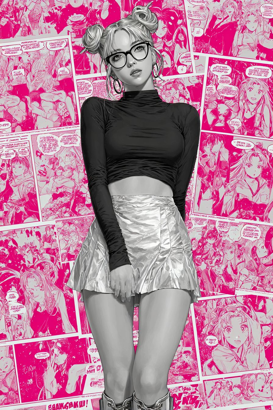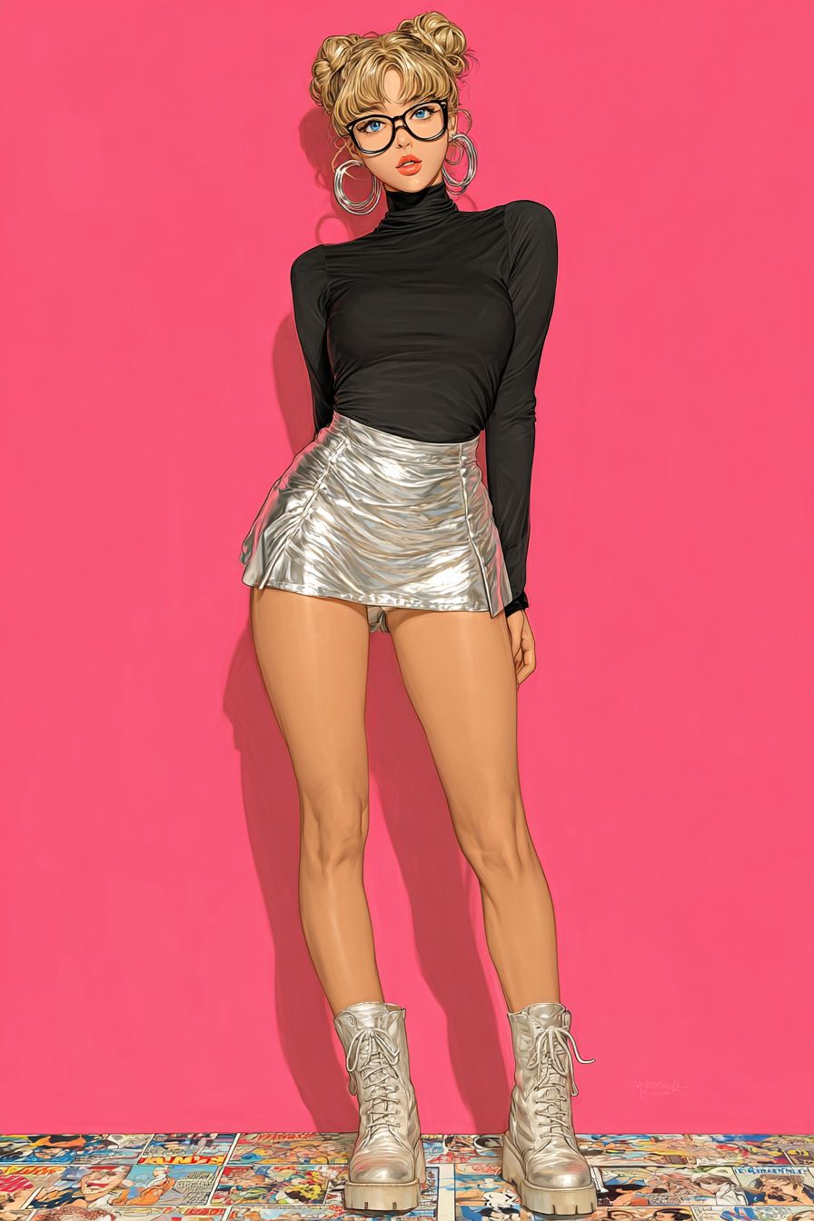A full-body fashion illustration of Usagi Tsukino with iconic blonde twin buns, wearing bold black-framed glasses, a fitted black turtleneck crop top, and silver hoop earrings. Paired with a pleated silver mini skirt and chunky combat boots, set against a neon pink background for striking contrast. Intricate brushstrokes capture glossy skin texture, with a confident gaze breaking out of a comic panel, blending pop art vibrancy with street-style edge. --ar 2:3 --s 750