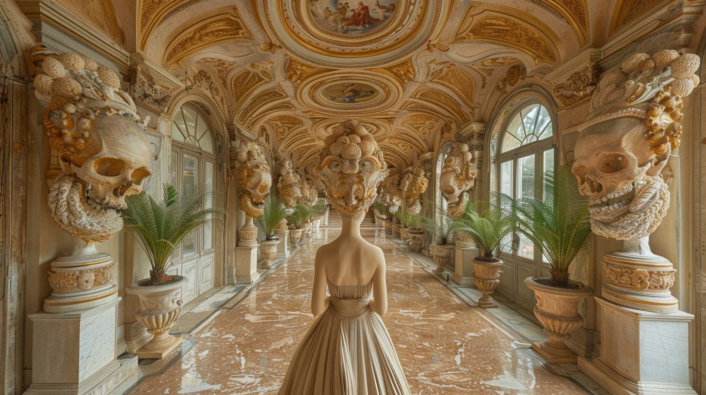 Hall of a magnificent baroque palace filled with golden statues of skulls and paintings of skulls, beautiful staircase, Renaissance paintings, marble columns, high plants, large windows --ar 16:9 --s 1000 --v 6.0