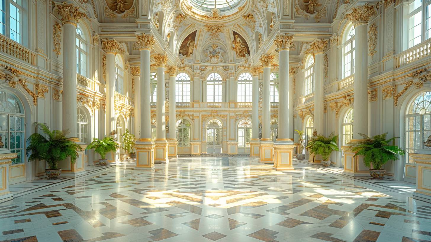 一座宏伟的巴洛克宫殿的大厅,充满了金色骷髅雕像和骷髅画作,美丽的楼梯,文艺复兴时期的画作,大理石柱,高大的植物,宽大的窗户。