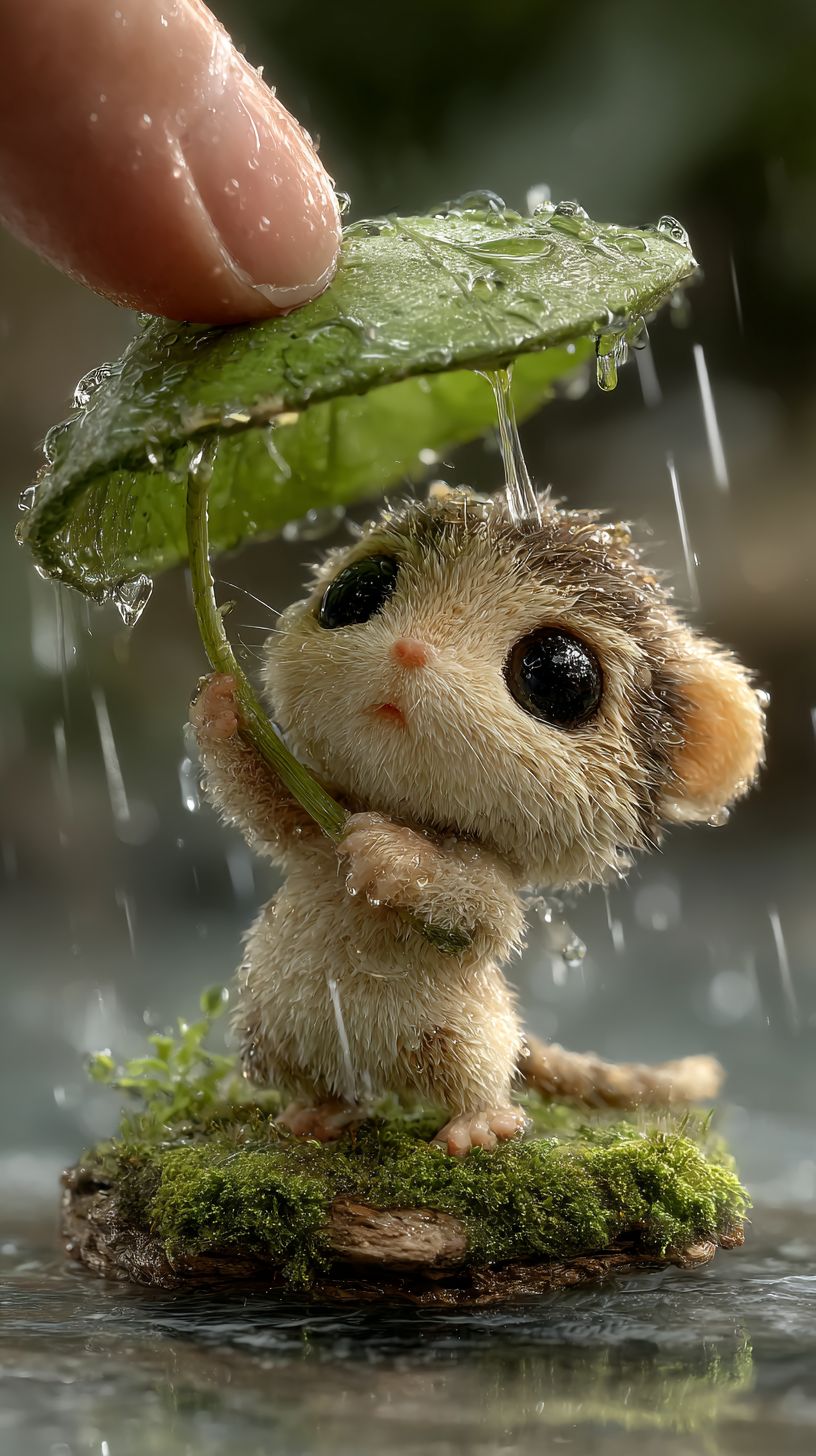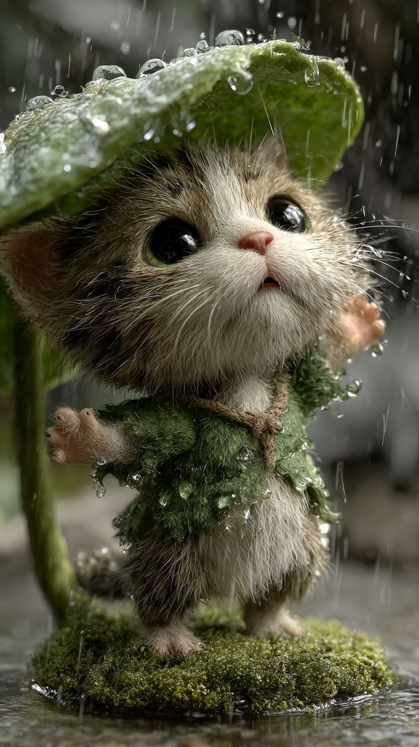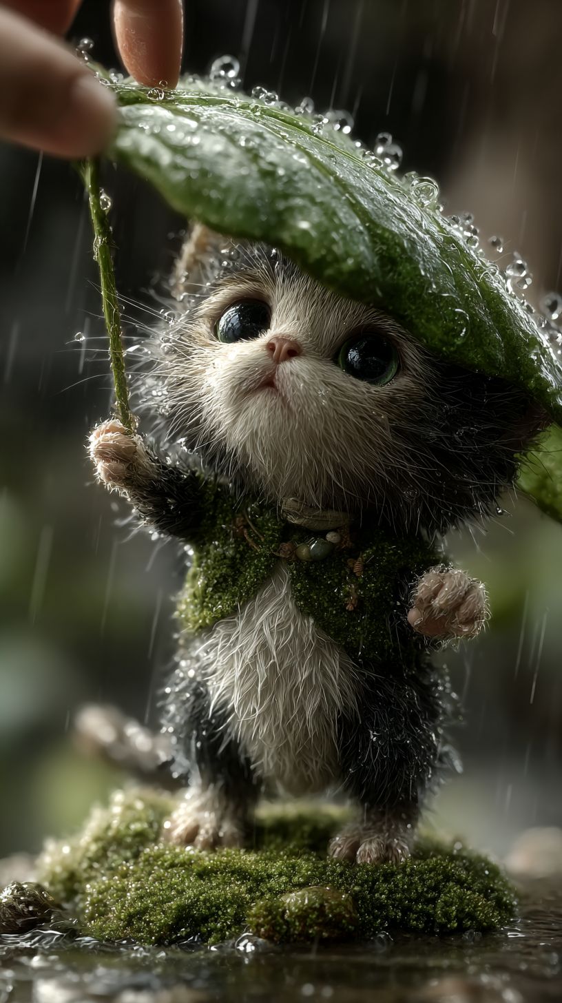 a hyper-realistic ultra-detailed cinematic close-up of a miniature kitten standing on a small moss-covered island in the middle of a water puddle during a heavy rainstorm, the kitten is soaked and looks up pleadingly with wide eyes, raising its tiny paws, a giant human hand gently holds a large green leaf above the kitten as shelter, raindrops stream off the leaf edges, dramatic lighting with backlit rain streaks, soft bokeh in the background, realistic wet fur textures, glistening water surface, shallow depth of field, studio-quality rendering, volumetric lighting, photorealistic reflections, emotional and whimsical mood, --ar 9:16 --s 750