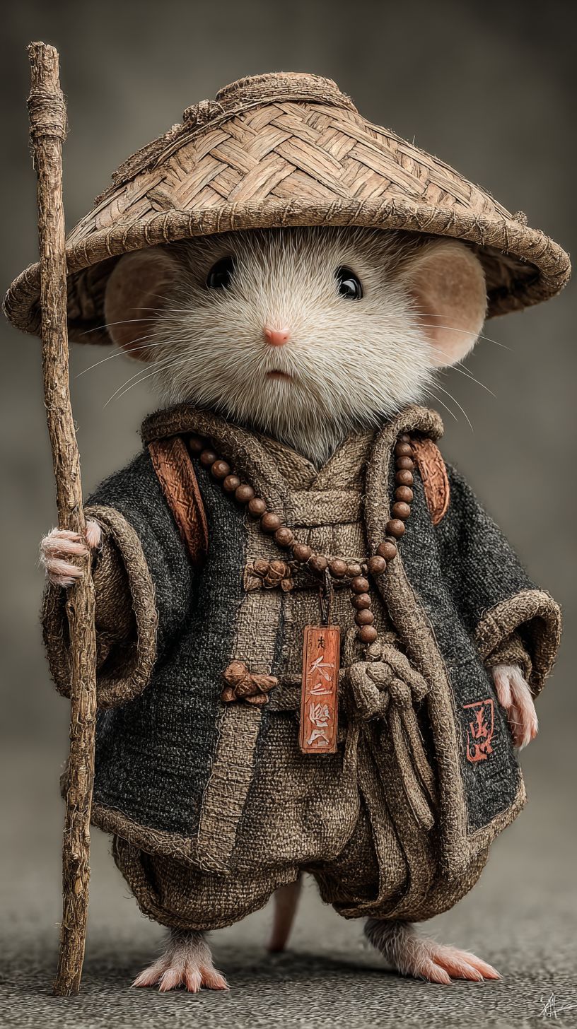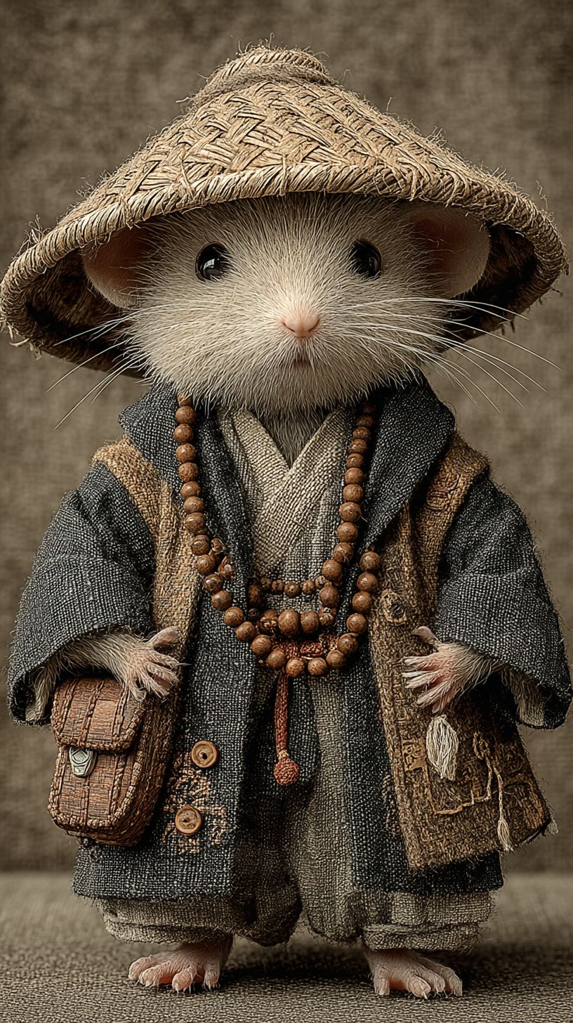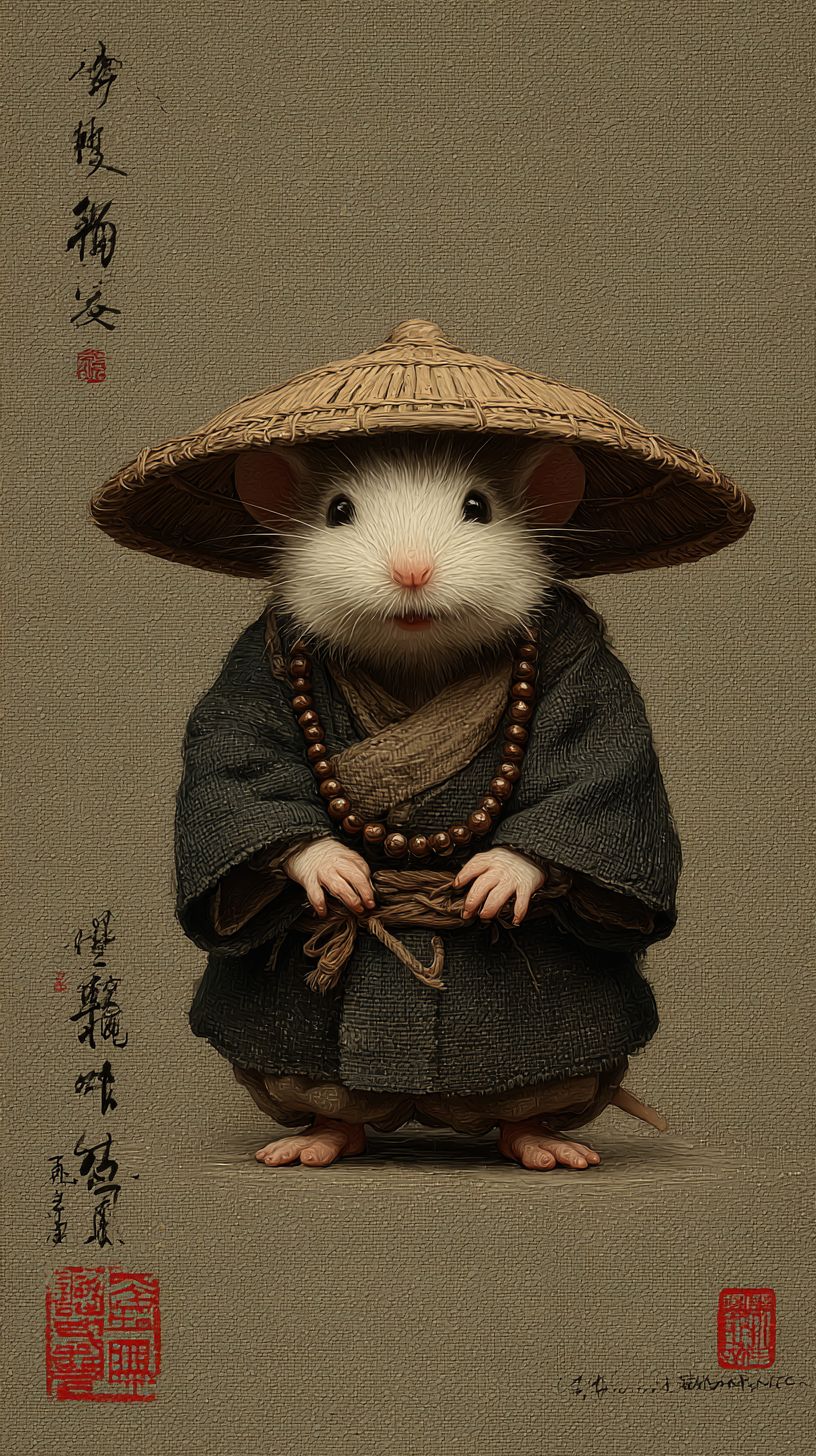 可爱的小老鼠穿着僧袍,坐着打坐,手中握着佛珠,头戴竹笠,展现了古风的魅力
