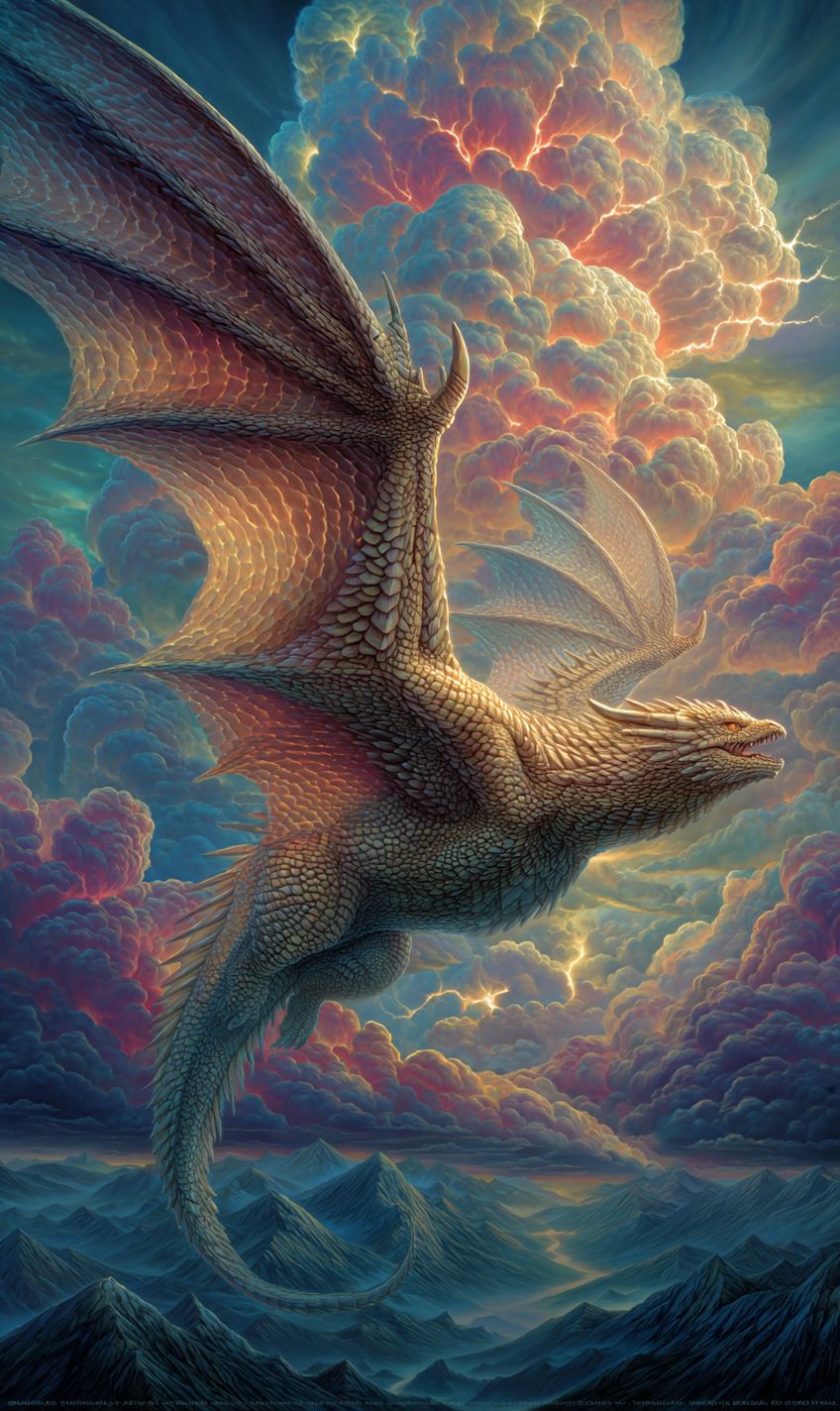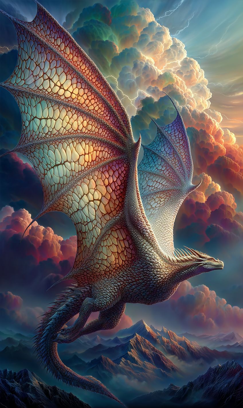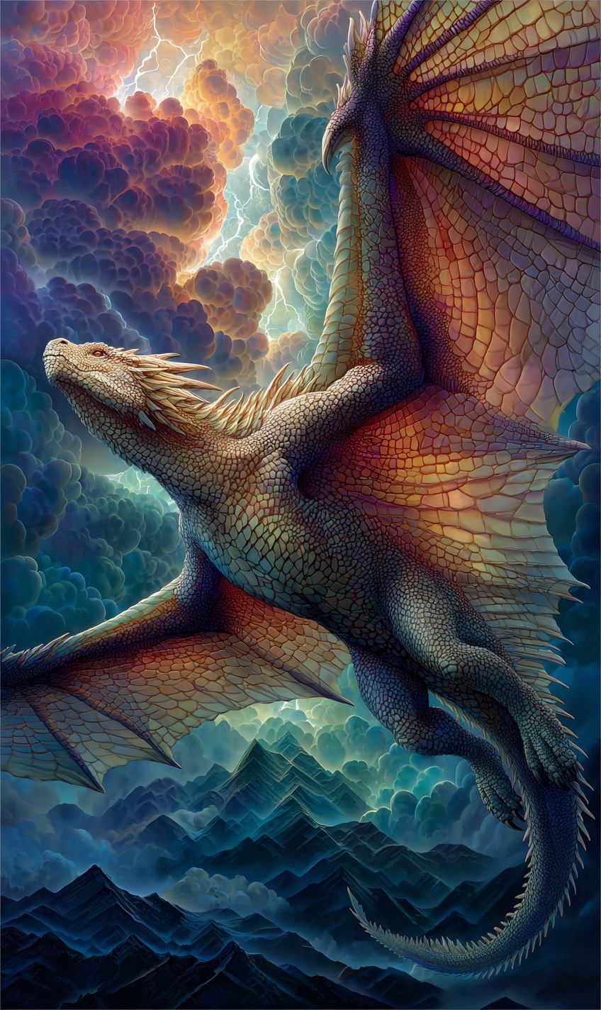 A fantasy dragon rider soaring through a stormy sky, dragon scales shimmering with lightning, rugged mountains below, epic action pose, hyper-detailed, Final Fantasy aesthetic, dramatic lighting --ar 3:5 --sref 3556861680 --v 7.0 --s 750