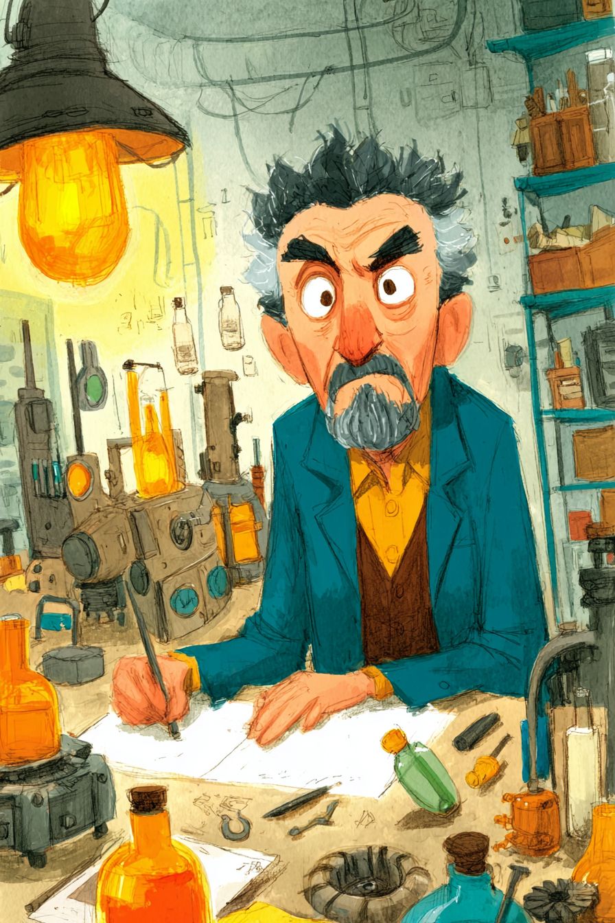 一个在杂乱工作坊中的蒸汽朋克发明家,周围是铜齿轮和发光的瓶子,复杂的机械在嗡嗡作响,温暖的灯光,超细致,维多利亚风格,电影般的构图