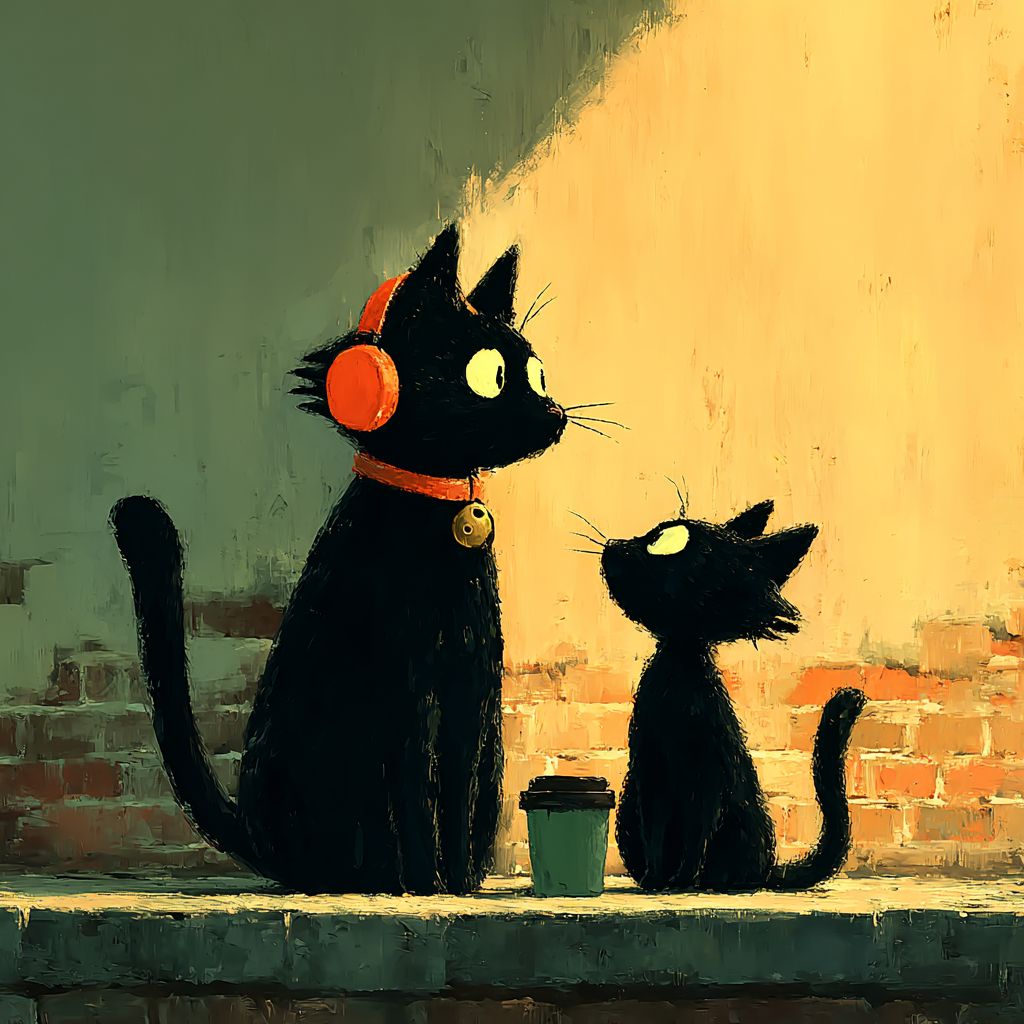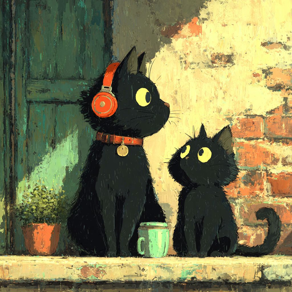 a black cat and a small kitten sitting face to face, gently looking into each other's eyes, their tails softly intertwined, the larger cat wearing a collar and round headphones, a coffee cup placed nearby, warm sunlight and soft shadows, Studio Ghibli-style, cute and emotional illustration, highly detailed, soft painterly texture, warm and dreamy atmosphere --s 750