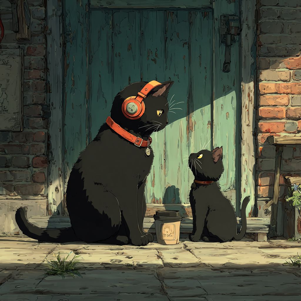一只黑猫和一只小猫面对面坐着,温柔地凝视着对方的眼睛,它们的尾巴轻轻缠绕在一起,较大的猫咪戴着项圈和圆形耳机,旁边放着一个咖啡杯,温暖的阳光和柔和的阴影,吉卜力工作室风格,可爱而感人的插图,高度细致,柔和的画笔质感,温暖而梦幻的氛围。