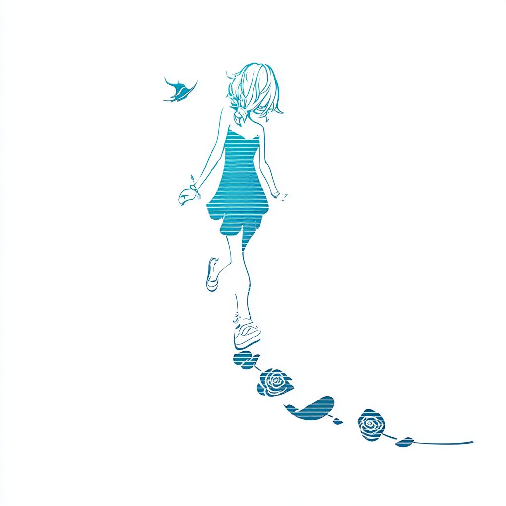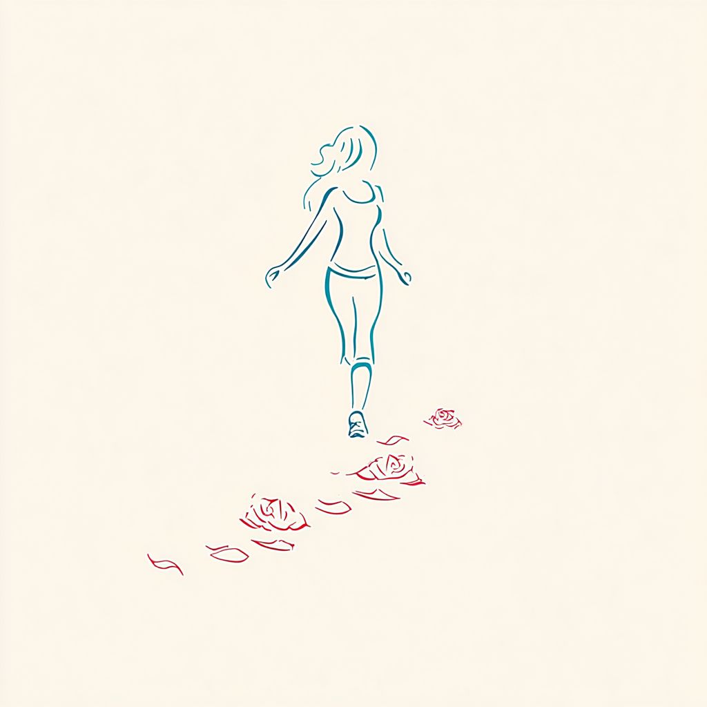 Elegant vector icon showing a woman stepping forward, footsteps behind her turn into a rose petal trail. Stylized hair, pastel turquoise accents, simple lines on white. --chaos 10 --stylize 300 --weird 500