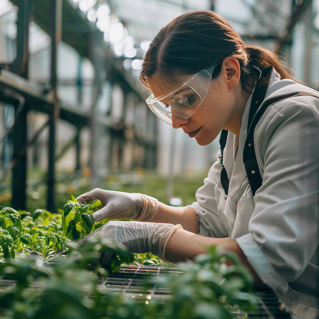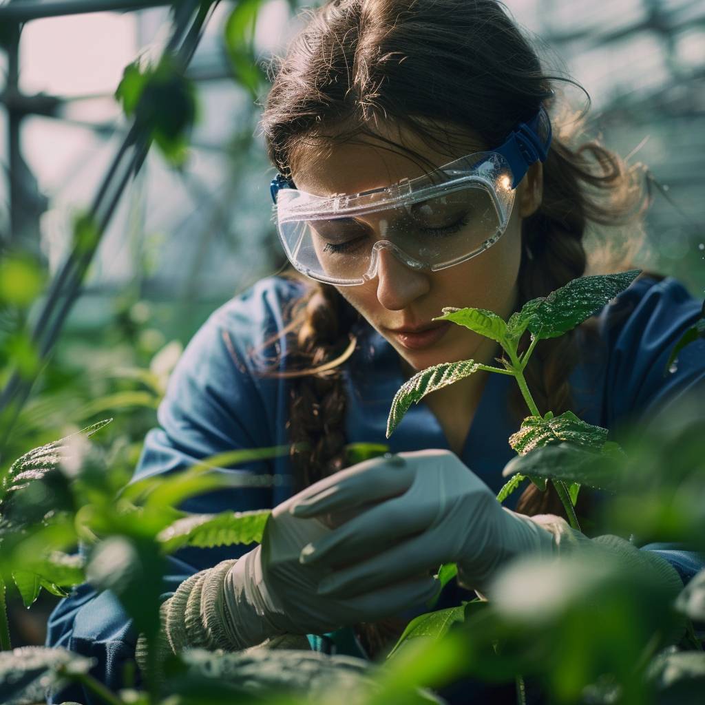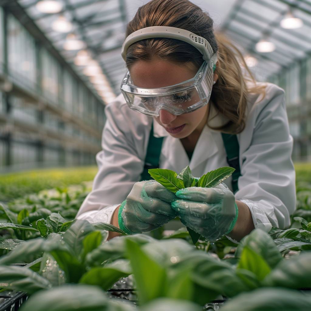 一位女科学家在现代温室中 examining 植物标本,手戴手套,佩戴防护眼镜,仔细观察绿叶,四周有高科技监测设备。
