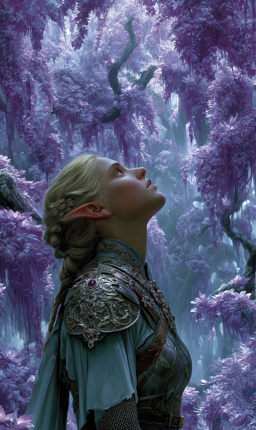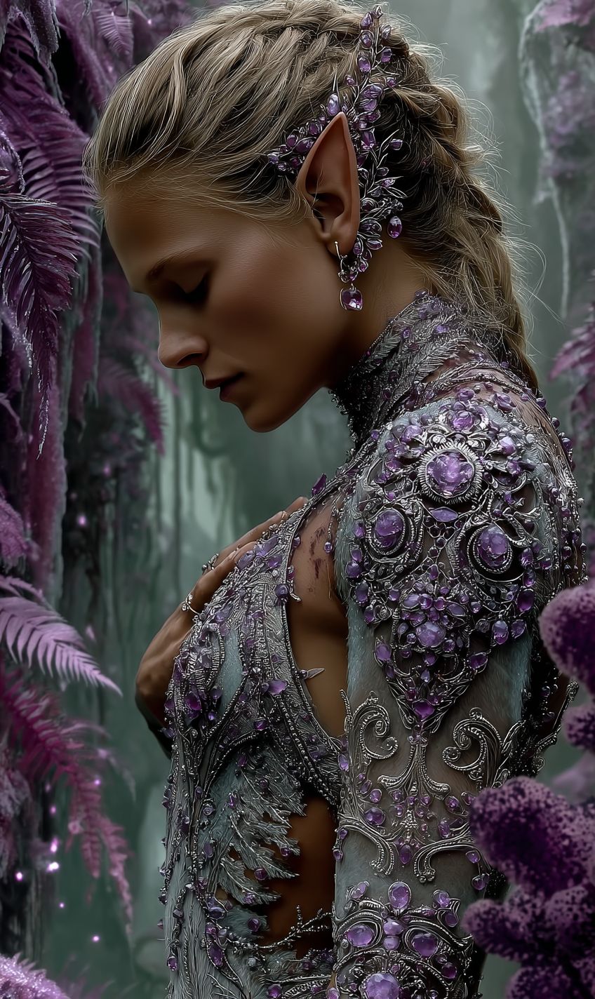 一位庄严的精灵女王站在一个被施了魔法的森林中,发光的生物发光植物,缥缈的雾气旋转,复杂的银色盔甲上镶嵌着宝石,柔和的月光透过古老的树木,具有吉卜力工作室的美学,超现实,生机勃勃的绿色和紫色。