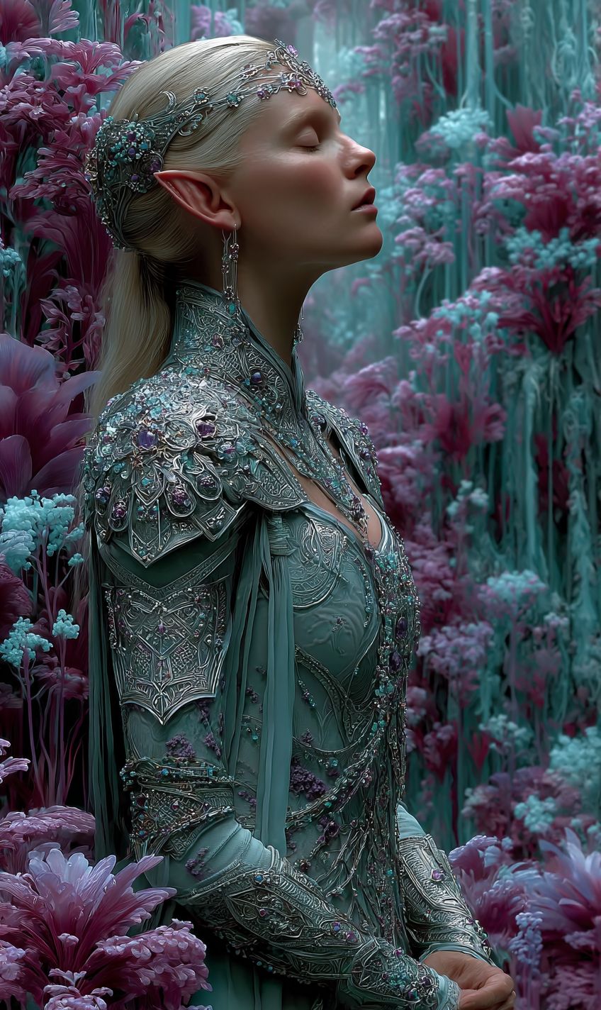 A majestic elven queen standing in an enchanted forest, glowing bioluminescent plants, ethereal mist swirling, intricate silver armor adorned with gemstones, soft moonlight filtering through ancient trees, Studio Ghibli aesthetic, hyper-realistic, vibrant greens and purples --ar 3:5 --v 7.0 --s 750