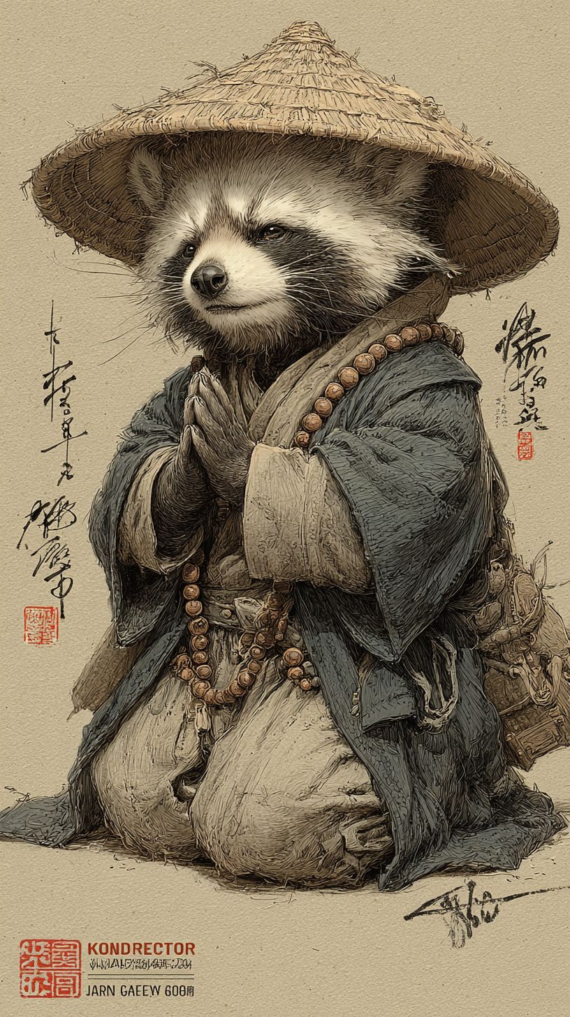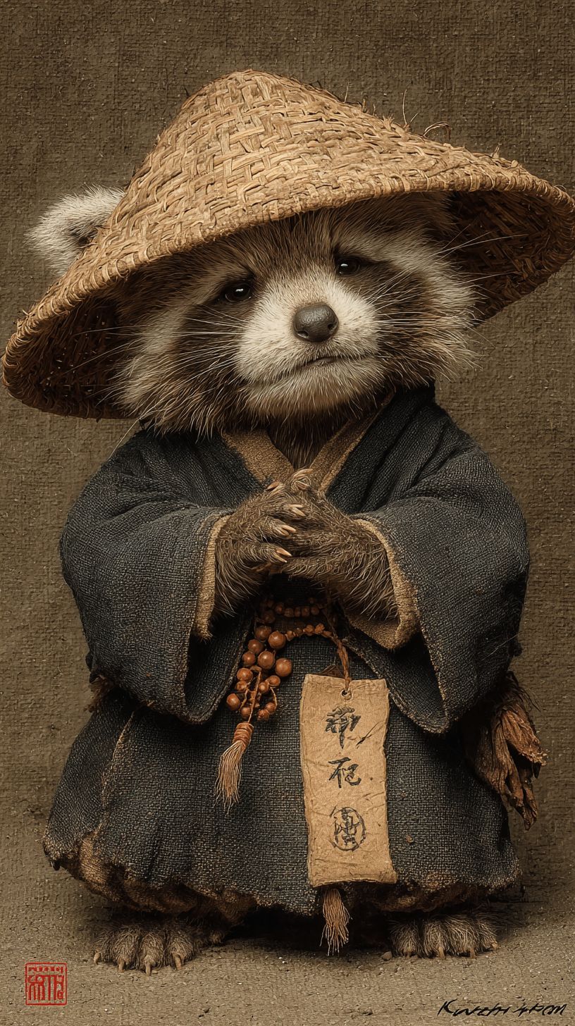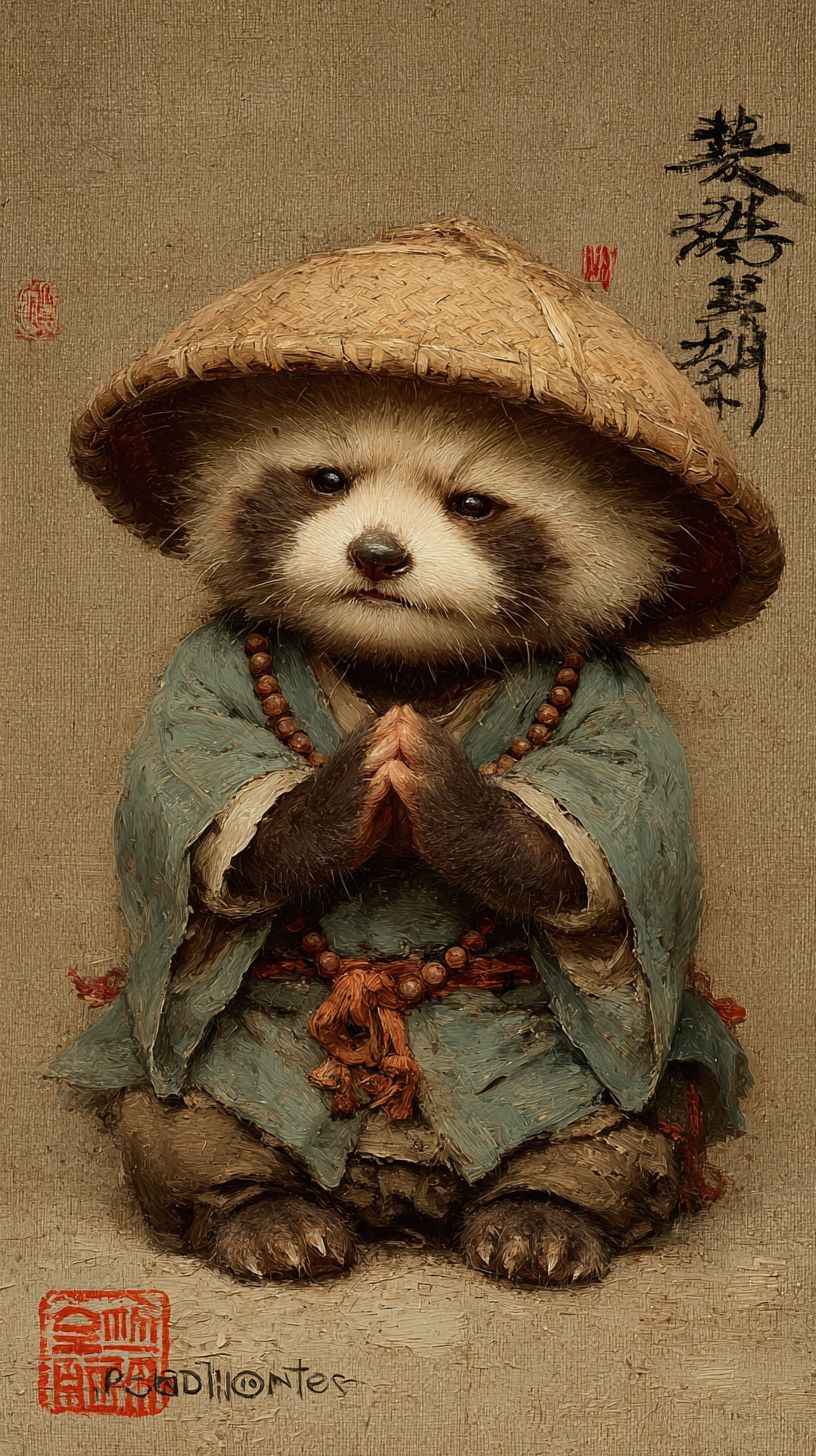 小浣熊穿着僧衣和佛珠坐姿,古风十足