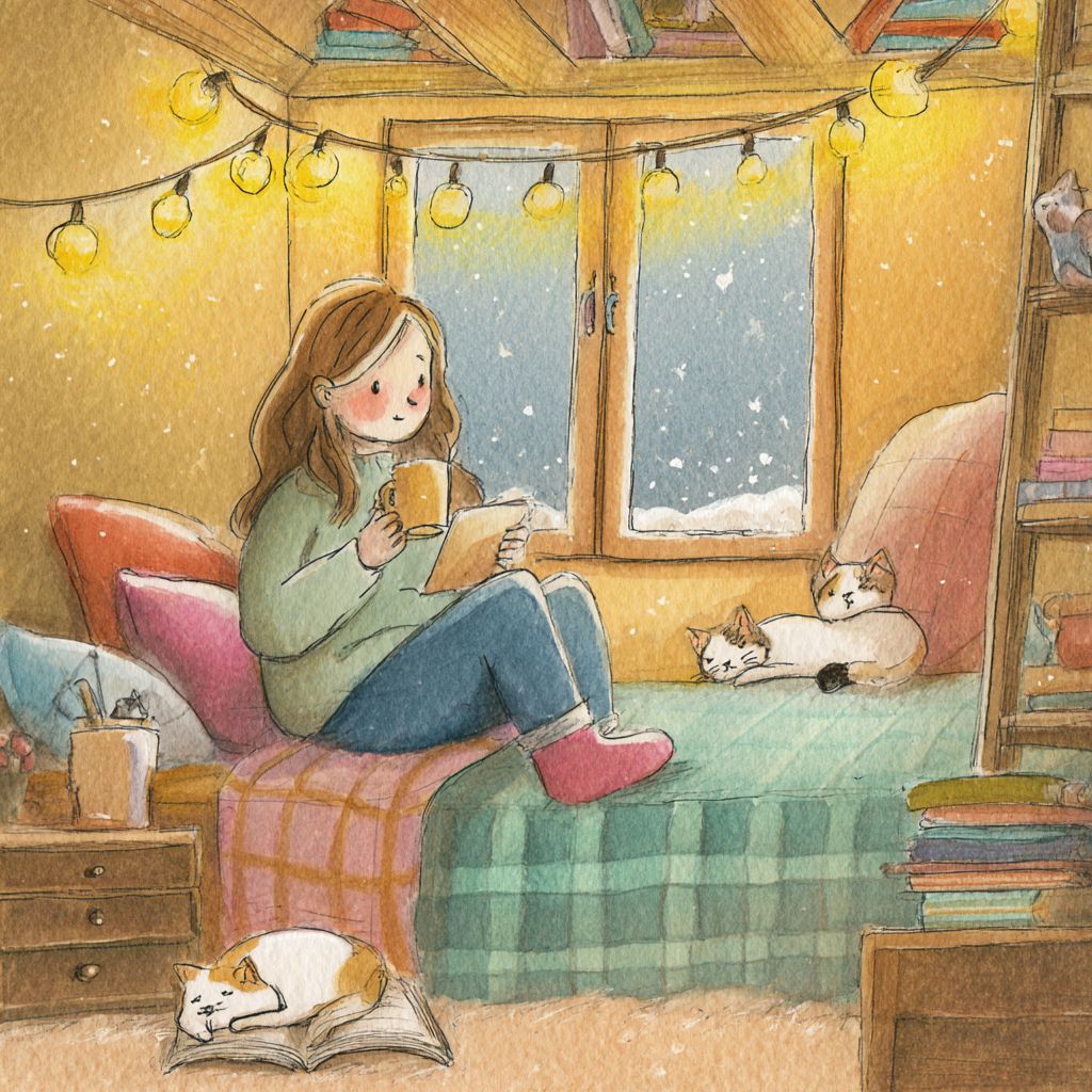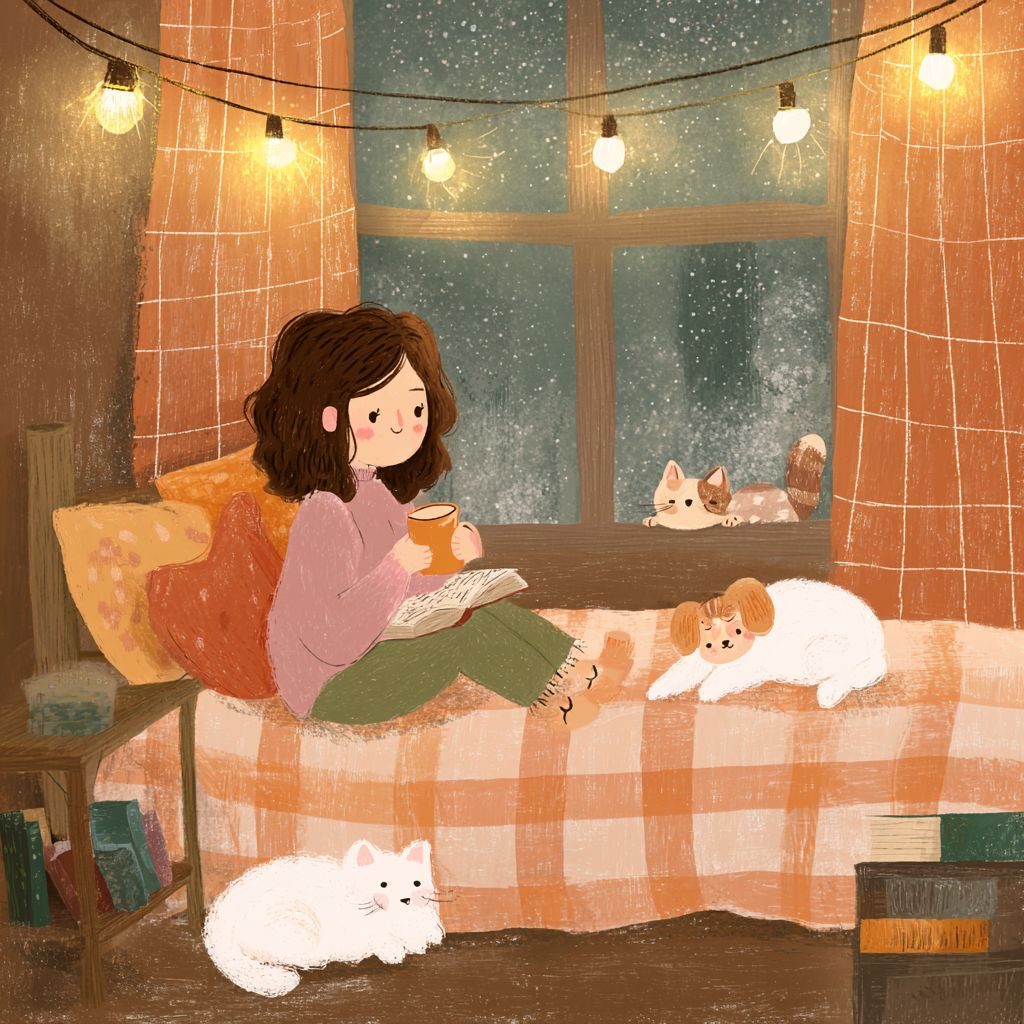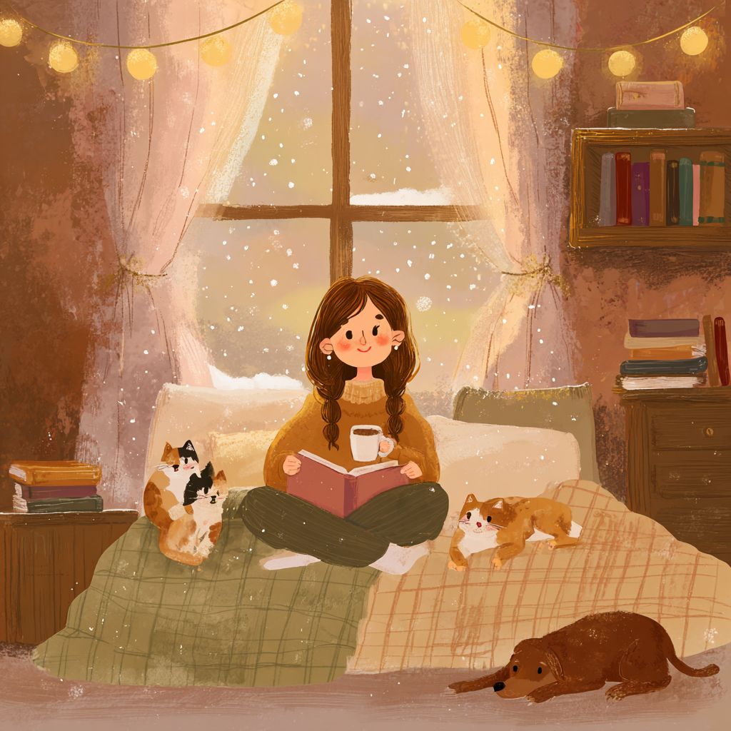 一个女孩坐在卧室的床上,手里拿着咖啡杯,正在看书,旁边有可爱的猫咪在睡觉。窗外飘着雪,营造出室内的温暖气氛。附近还有一只狗躺着。这个场景用手绘艺术描绘,温暖的色调,格子毛毯,天花板上挂着小灯,木质家具。这营造了一个舒适的氛围,让人们可以在家中放松或独自学习,感到舒适。