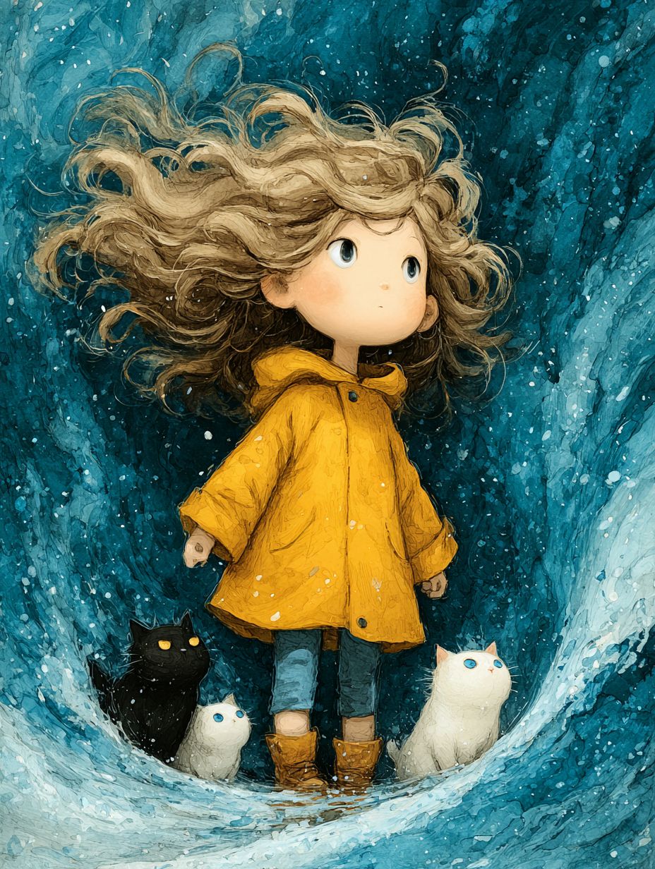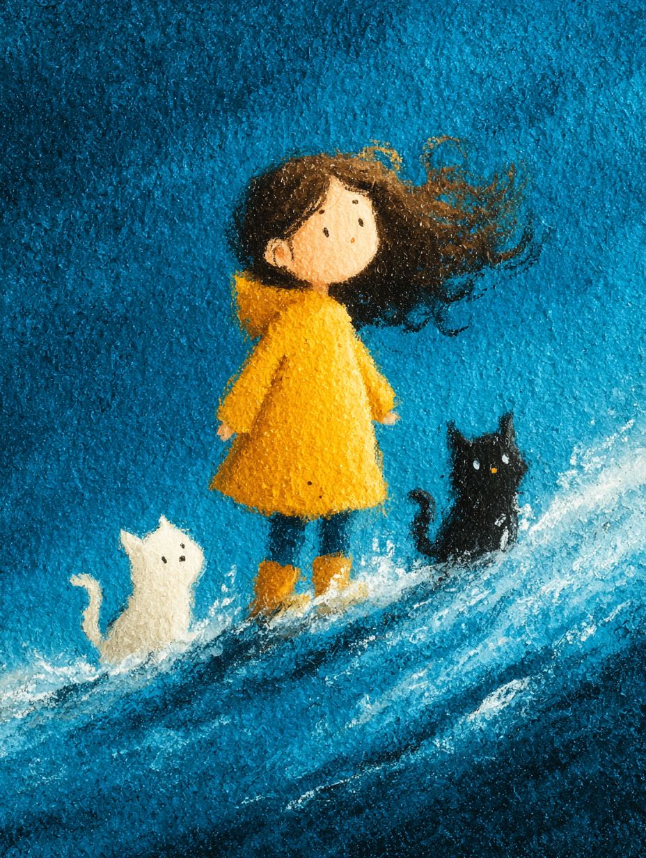 一个可爱的小孩穿着黄色雨衣,正在踩水坑,长着卷曲的长发。在他们身后有三只小猫:一只白色的,带有淡淡的黄色,一只黑色的,另一只是一只四川剑州猫,带有白色斑纹的虎斑猫。背景是蓝色的,使用彩色铅笔绘制,展现了手绘的笔触和纹理。有一个大面积的蓝色,干净的背景,以及角色显得渺小的广阔场景。风格治愈,以柔和的色彩组合为特点。