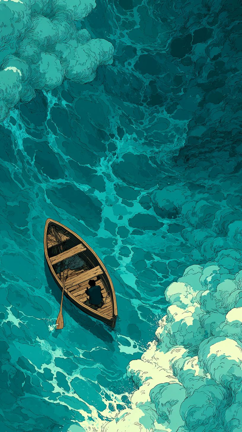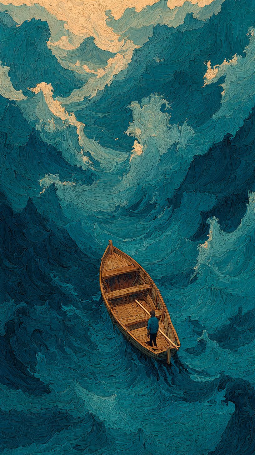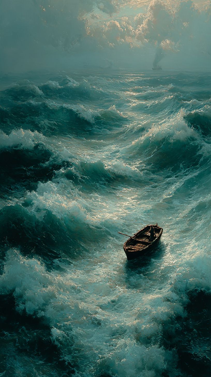 一个暴风雨海洋场景,一只小船在波涛汹涌的海浪中航行。船内,一位孤独的身影勇敢地面对自然的考验。艺术风格原始,捕捉了自然愤怒的原始本质和人类精神的韧性。