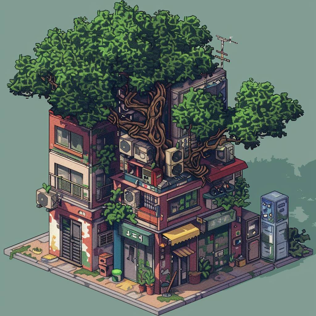 树中的建筑等距干净像素艺术图像,风格类似于《东京危险》