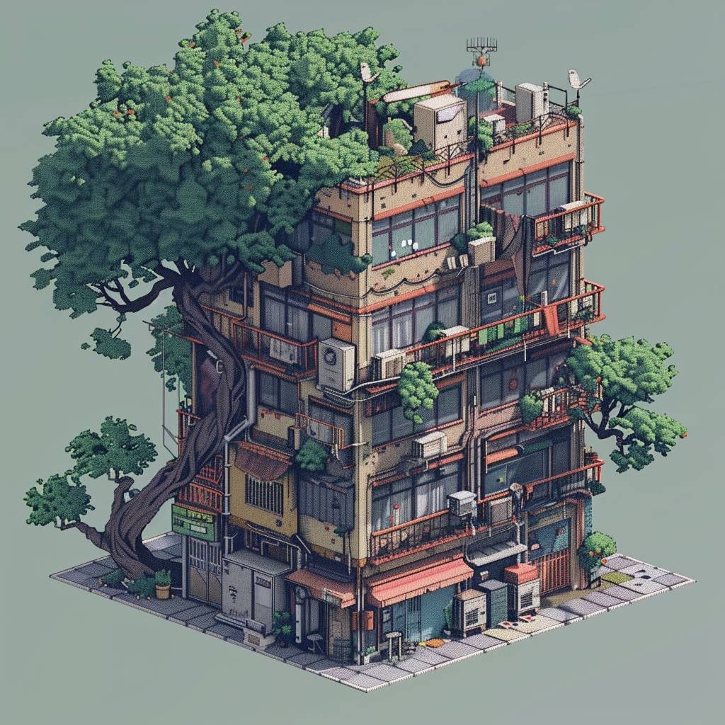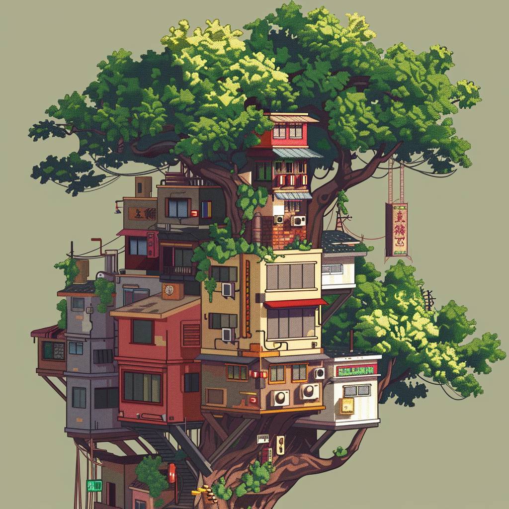 Isometric clean pixel art image of building in tree , style of tekkonkinkreet --v 6.0