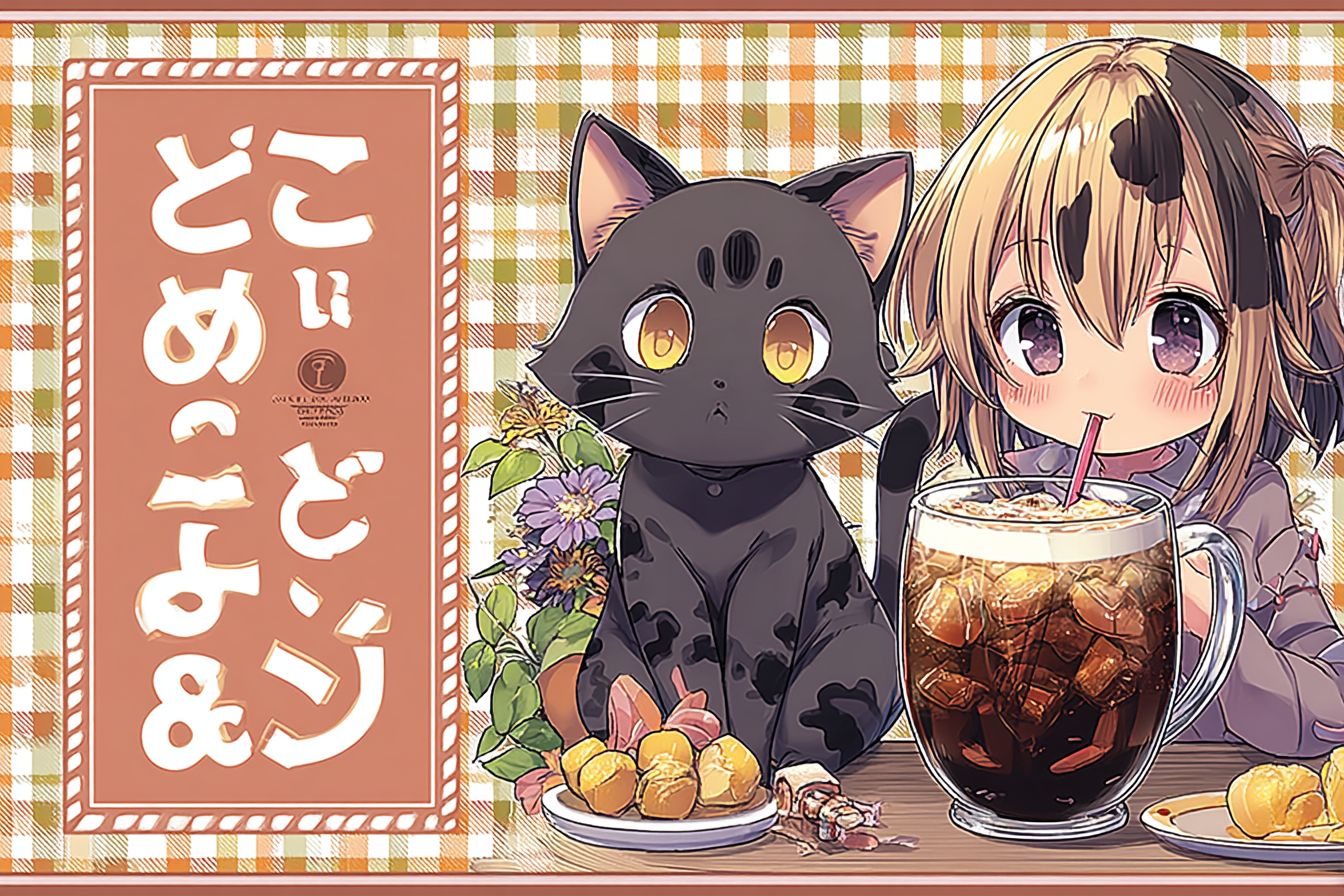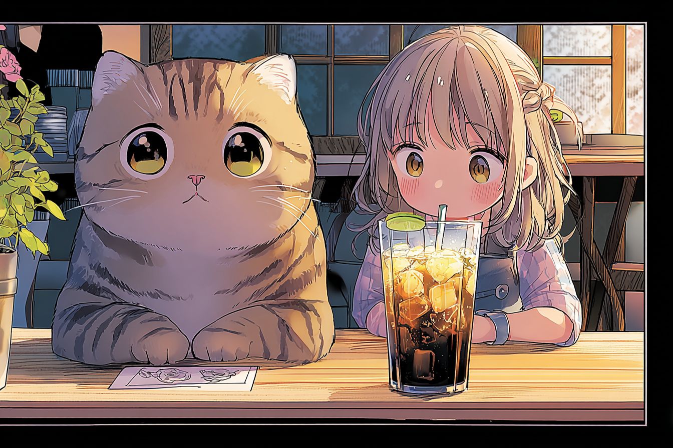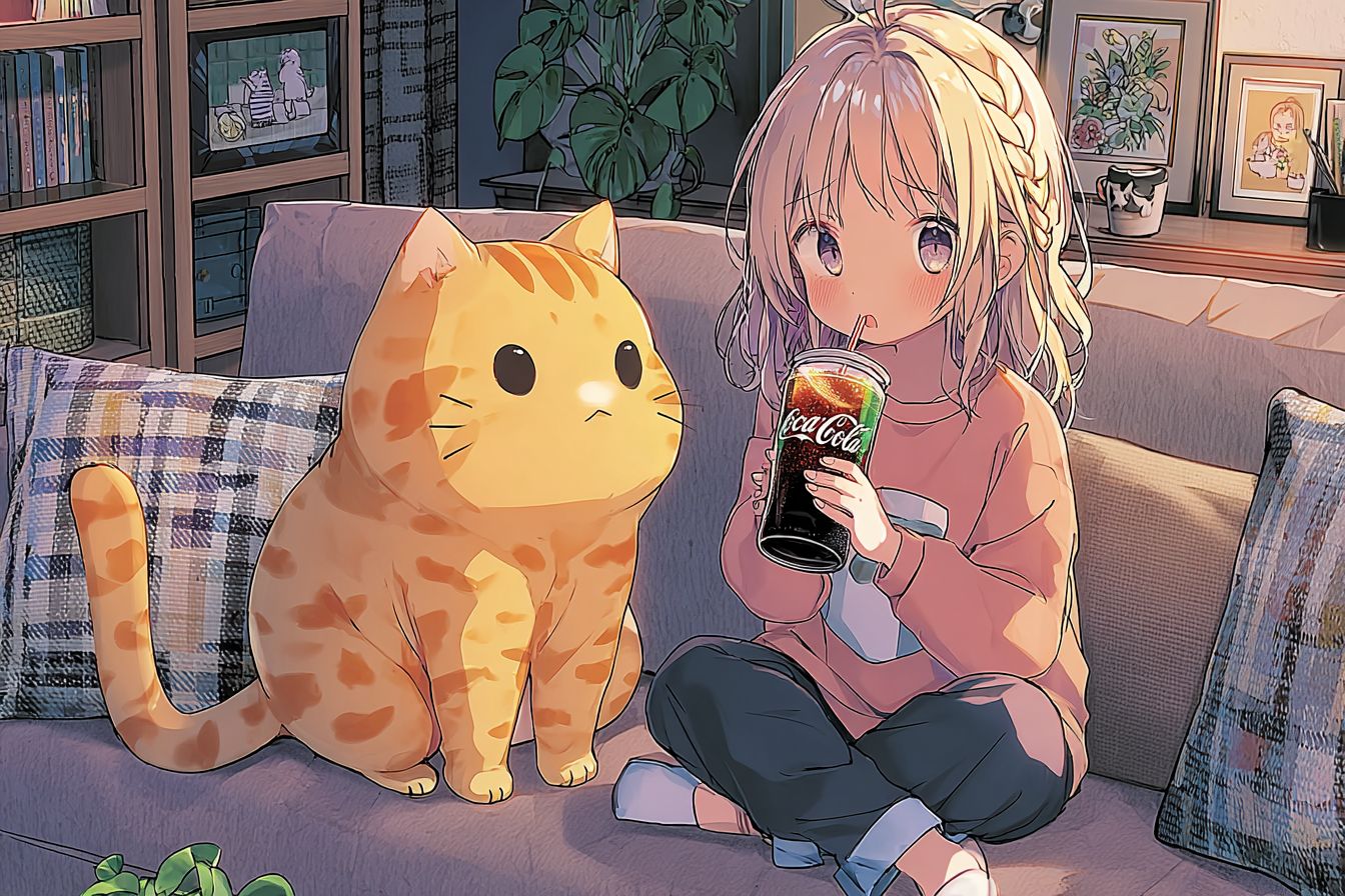A cat and a girl drinking cola. --v 7.0 --sref 3995075434 944304602 --ar 3:2