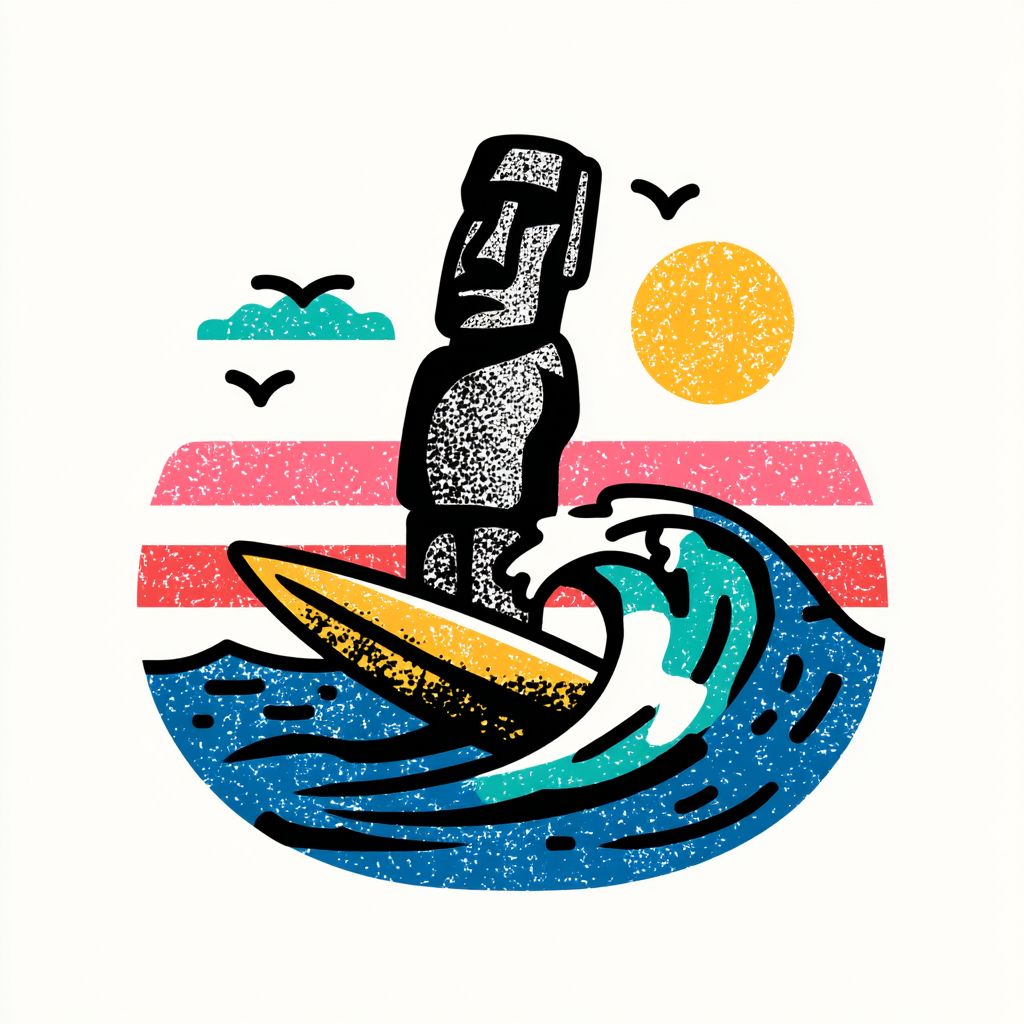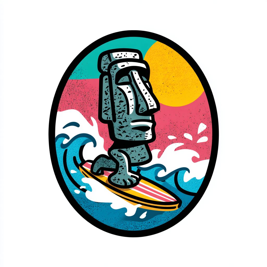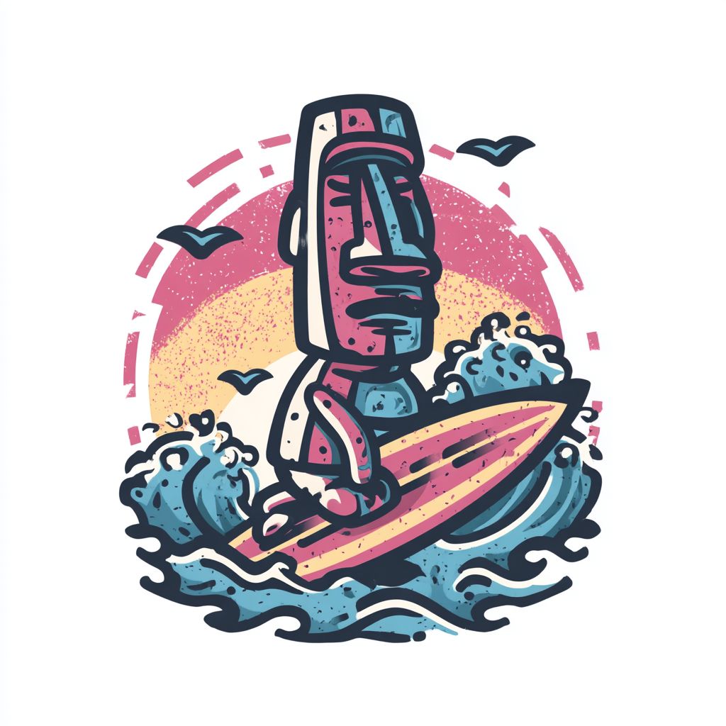 T恤logo设计,卡通手绘,复活节岛莫艾石像站在冲浪板上,骑着蓝色的海浪,粗线条,鲜艳的颜色,纯白背景,图案位于图像的中间。