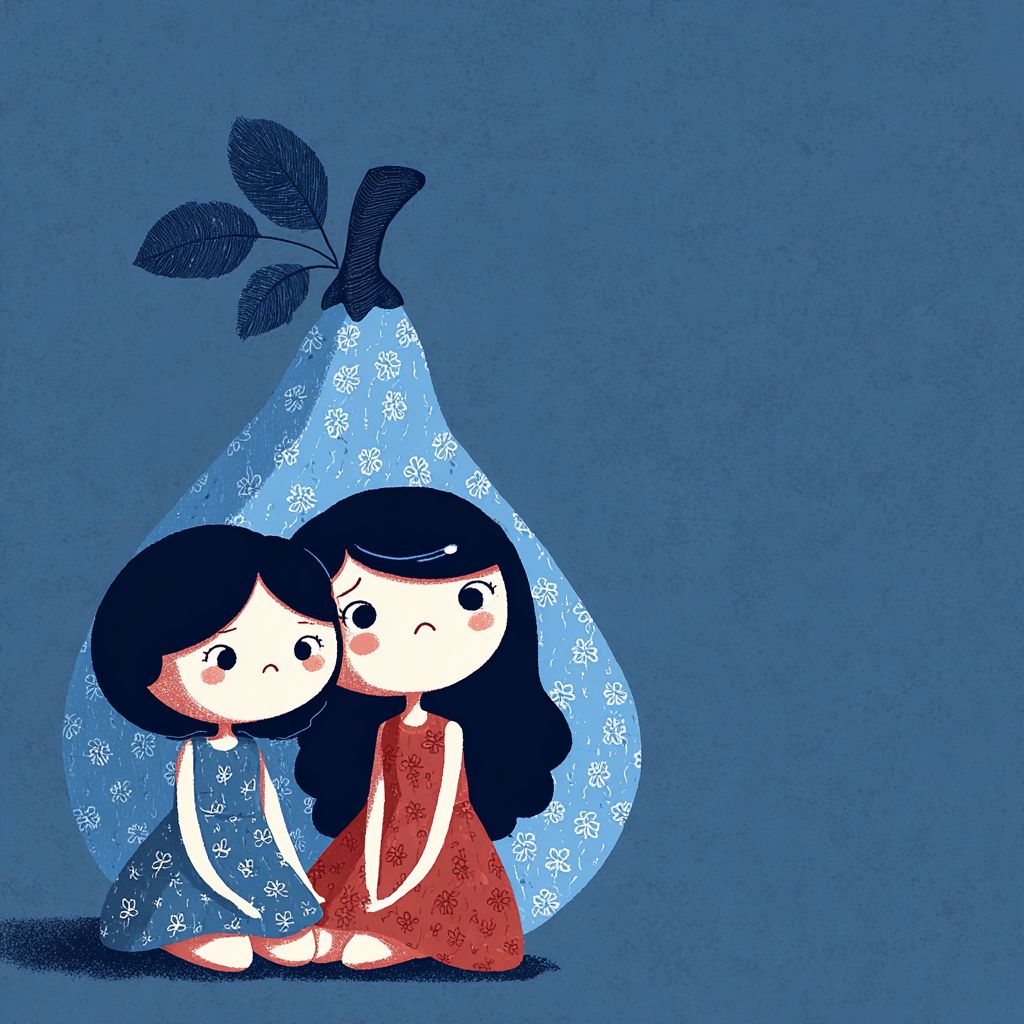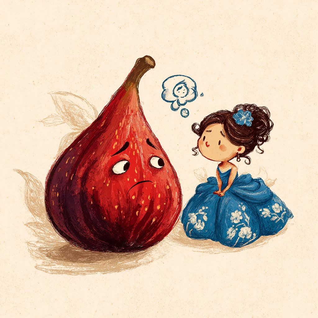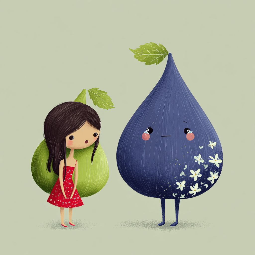 draw me a cute fig fruit that has a face and cries because it was forgotten by another fig fruit that is having fun far away with its friends. both figs are brunette girls. the fig that cries has a red dress. the fig in the distance has a blue dress with white flowers. The fig girl in the blue dress should be cheerful. She should not look at the other fig. --v 7.0