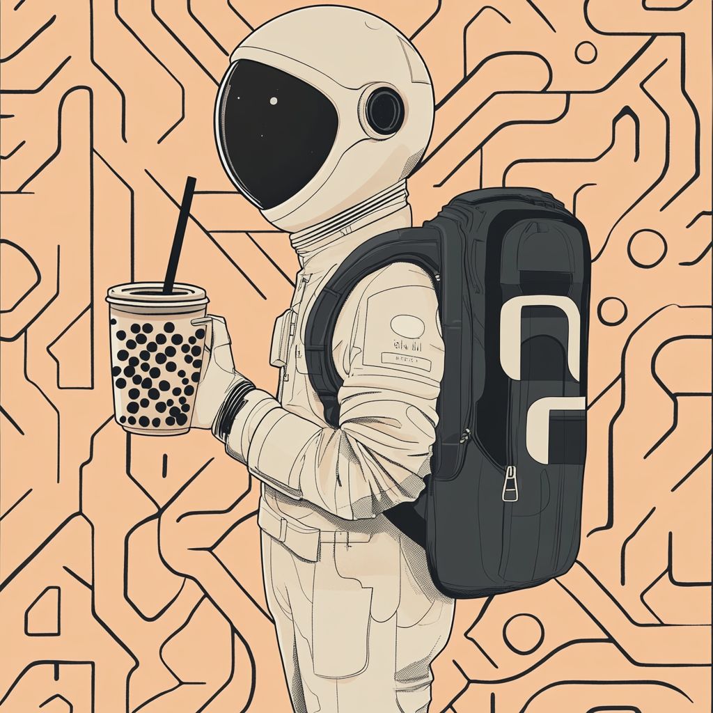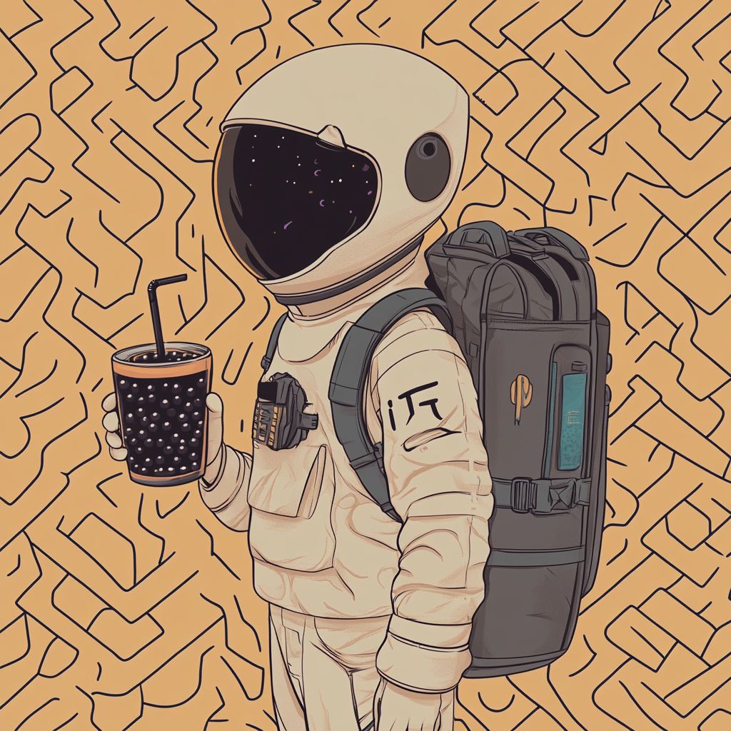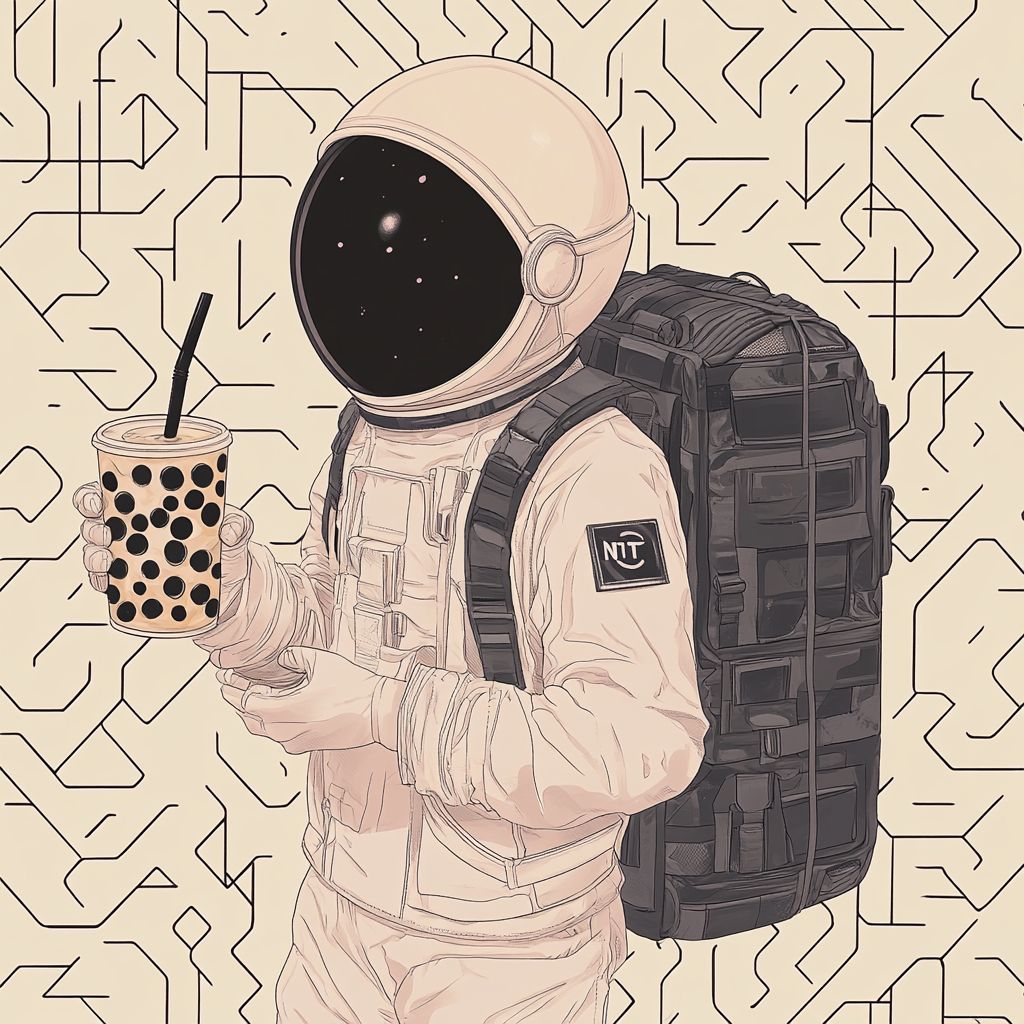 宇航员穿着米色宇航服,手握黑珍珠奶茶,背景是黑米色迷宫图案