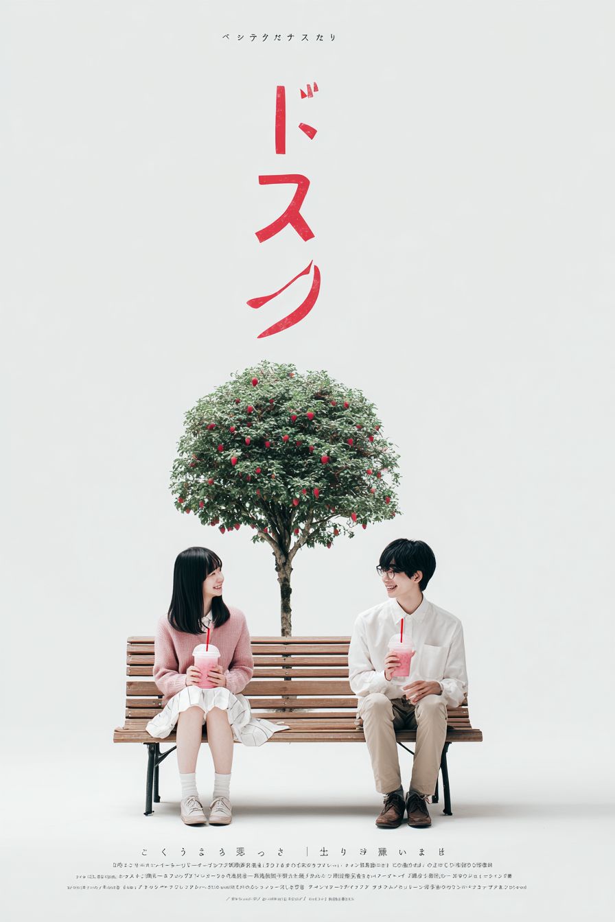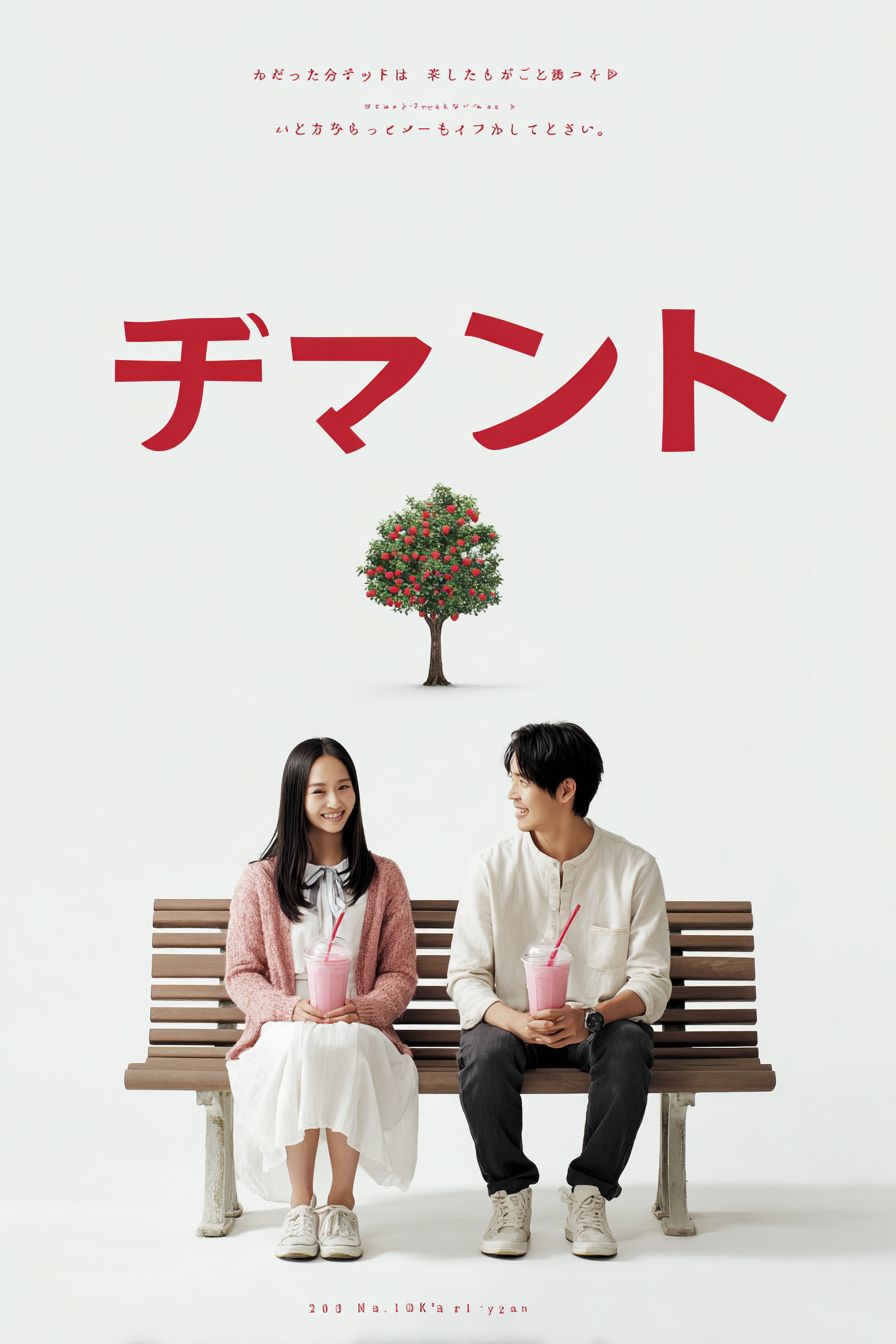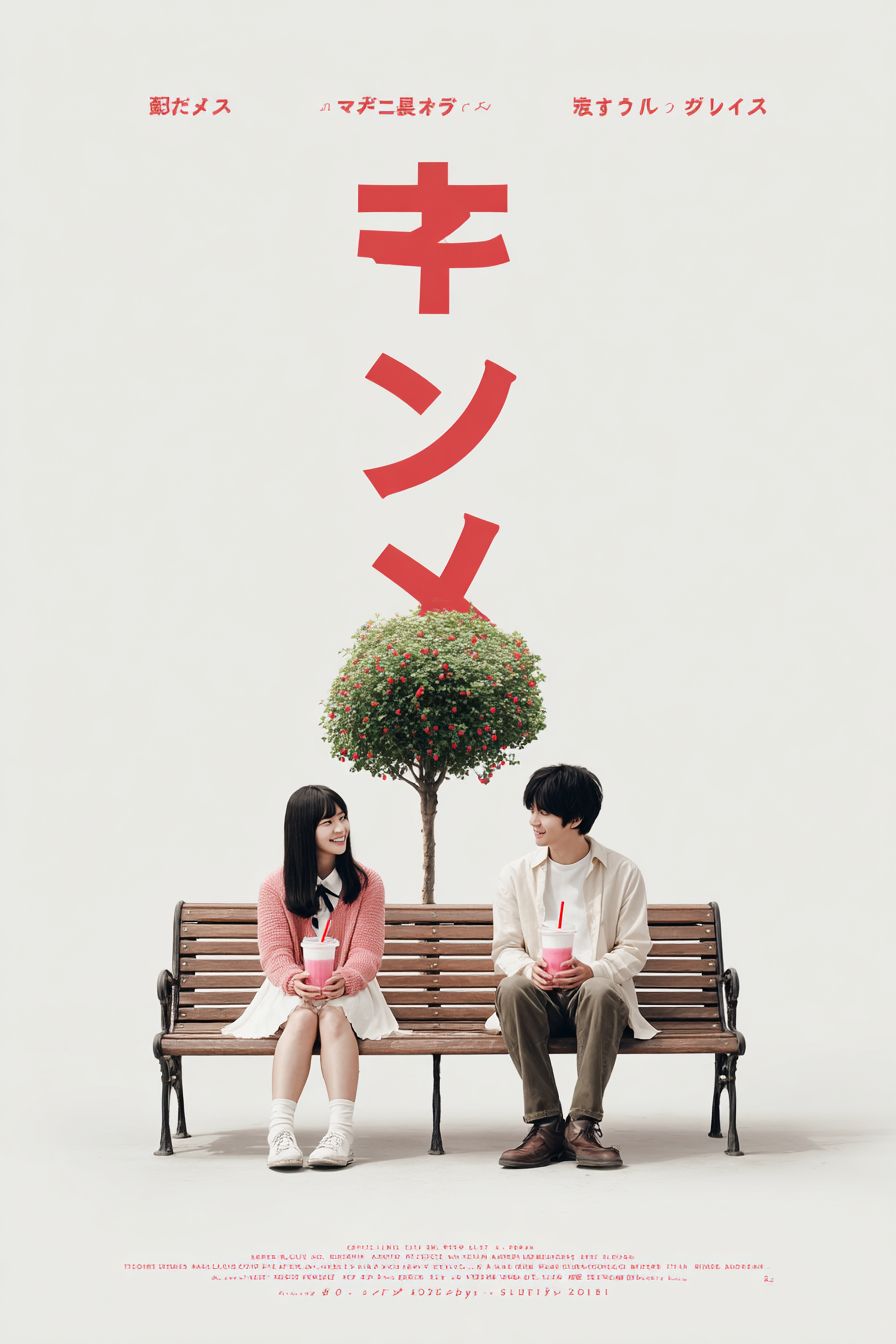 简约电影海报,远景俯拍(高角度视图)。一张简单的木制公园长椅放置在干净的白色背景上。长发直顺的年轻女性坐在长椅上,肤色较浅,穿着粉色开衫,搭配白色带蝴蝶结的衬衫,微笑着手里拿着一个透明塑料杯,杯中是粉色草莓牛奶饮料,配有红色吸管。在她面前,年轻的男性则微笑着站立,肤色较浅,穿着浅色衬衫,同样手持相同的饮料。在他们身后,一棵孤立的草莓树,清晰的剪影反衬在白色背景上。优雅的简约电影构图,灵感来自日本电影海报,电影标题采用大胆的红色居中排版。