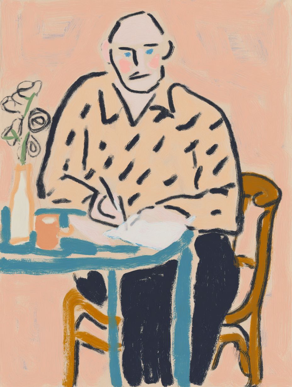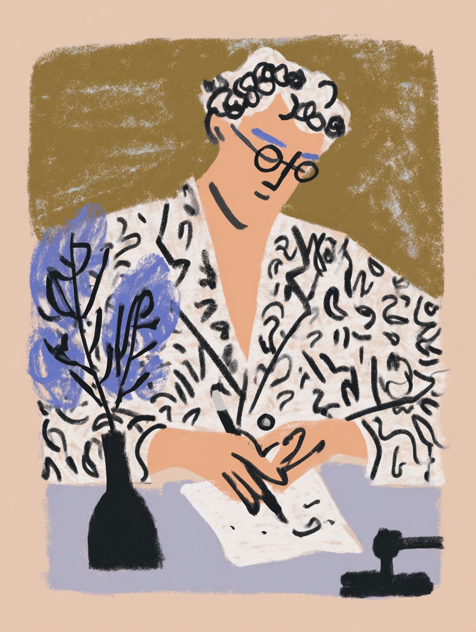 一幅极简风格的花卉草图,展示了裁缝在桌前的身影