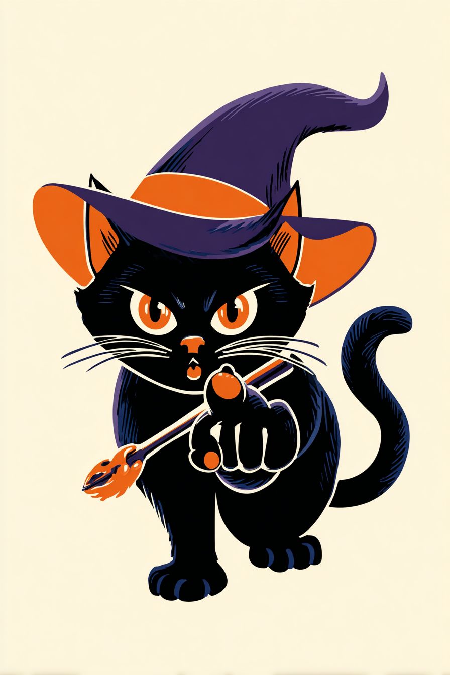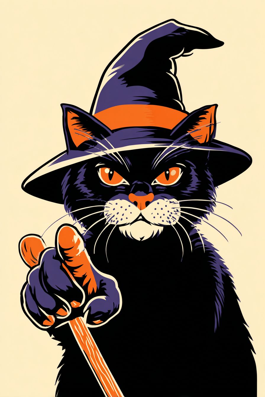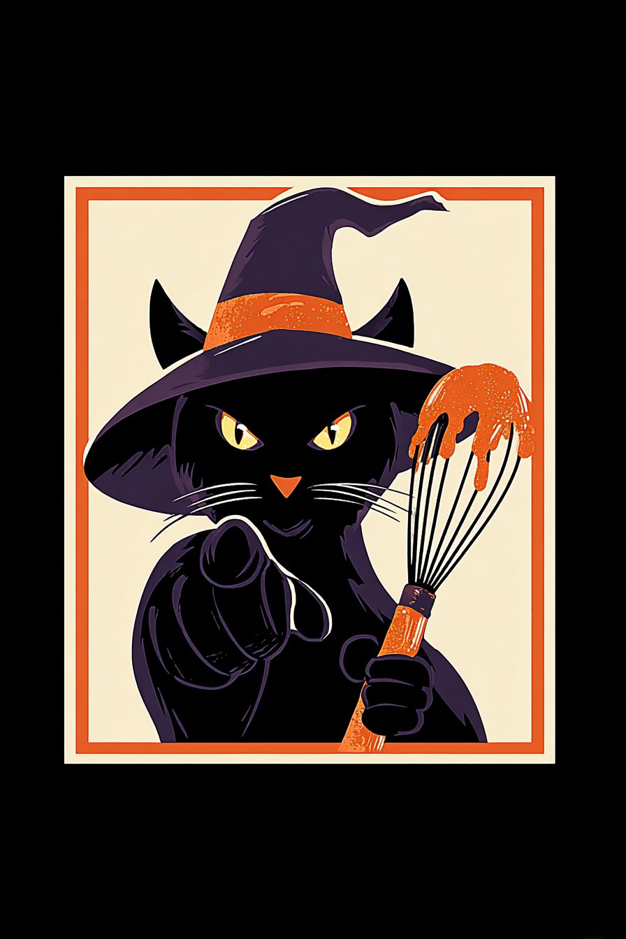 黑猫戴尖顶女巫帽,用面包打蛋器指向观众,呈现复古宣传海报风格