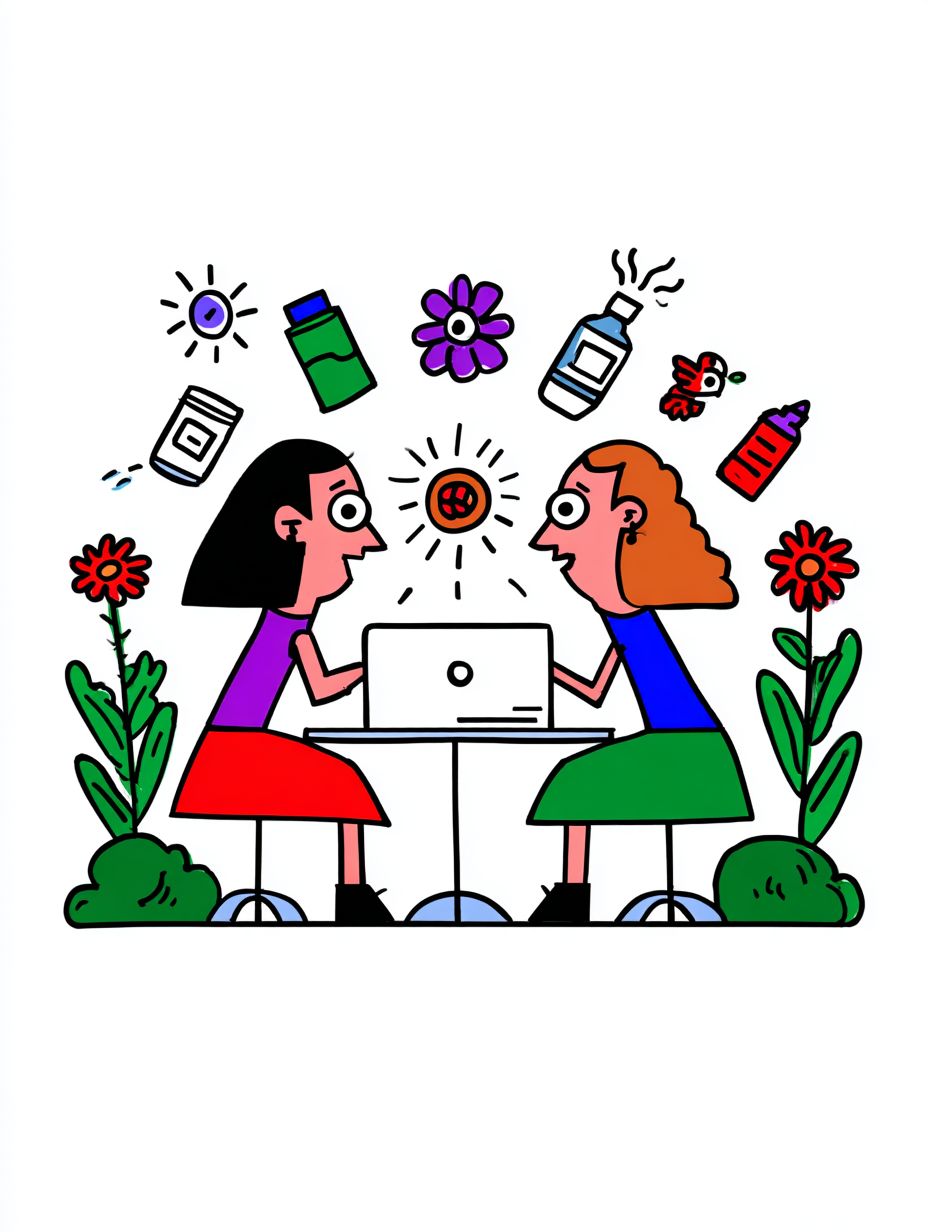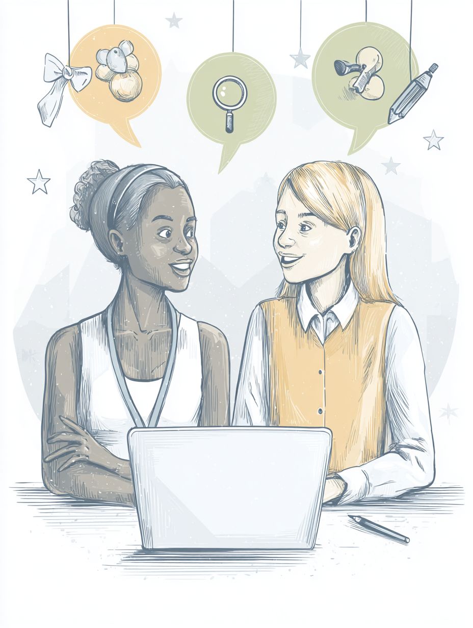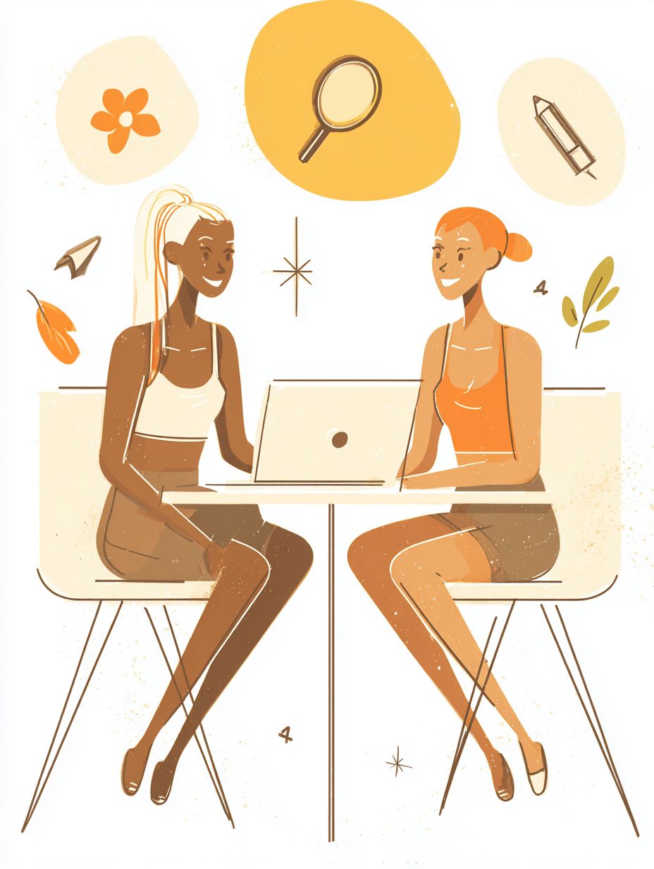 Simple illustration, white background, icon style, two women in a business meeting, client and designer sitting at a table, a laptop placed in the center between them, pop and simple vector drawing, clean lines, colorful, minimal design, friendly atmosphere, above their heads simple icon symbols: a flower, a magnifying glass, a pencil, and a star, modern and playful --chaos 5 --ar 3:4 --stylize 50 --weird 100 --v 7.0