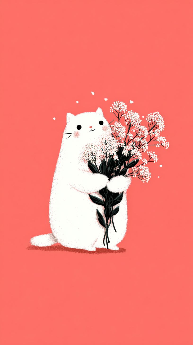 A white cat cradling a bouquet of flowers, set against a bright background, in a romantic and adorable animated style. high contrast, 8K --ar 9:16 --raw --v 7.0
