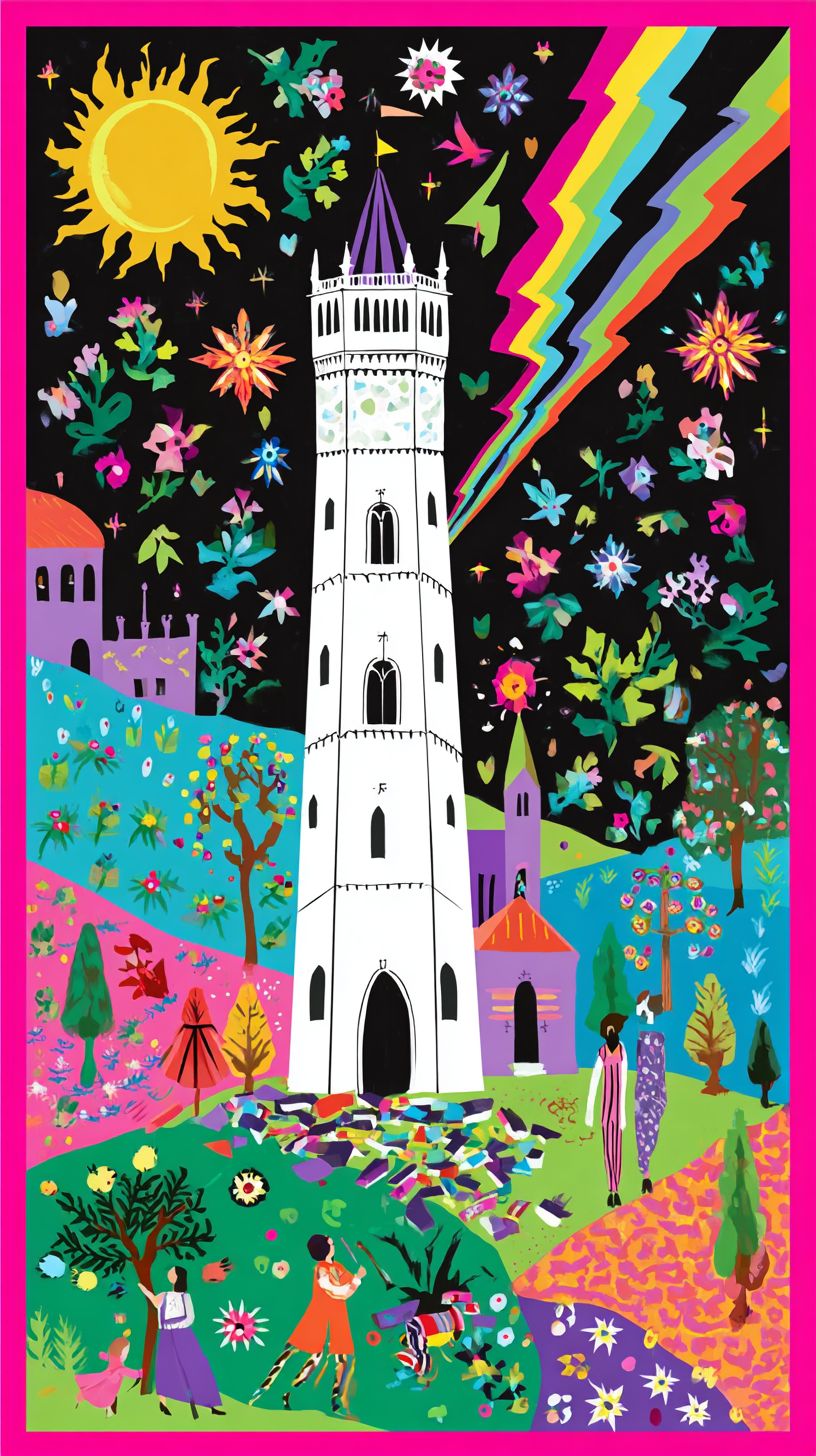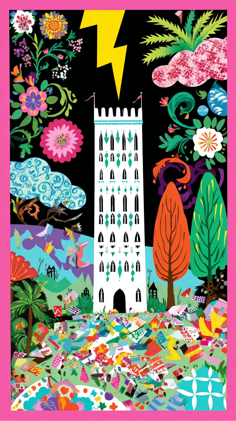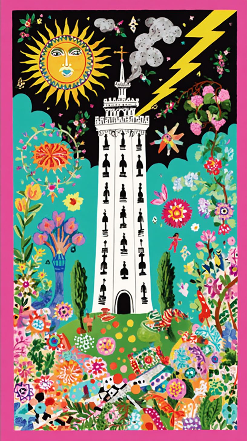 The Tower Tarot card featuring a tall white tower being struck with one huge black lightning bolt as 2 people fall to the ground below that is covered in debris from the tower explosion. simple shapes, and a dark background, --ar 9:16 --sref 2009687028 --profile cp8lxy1 --sv 4