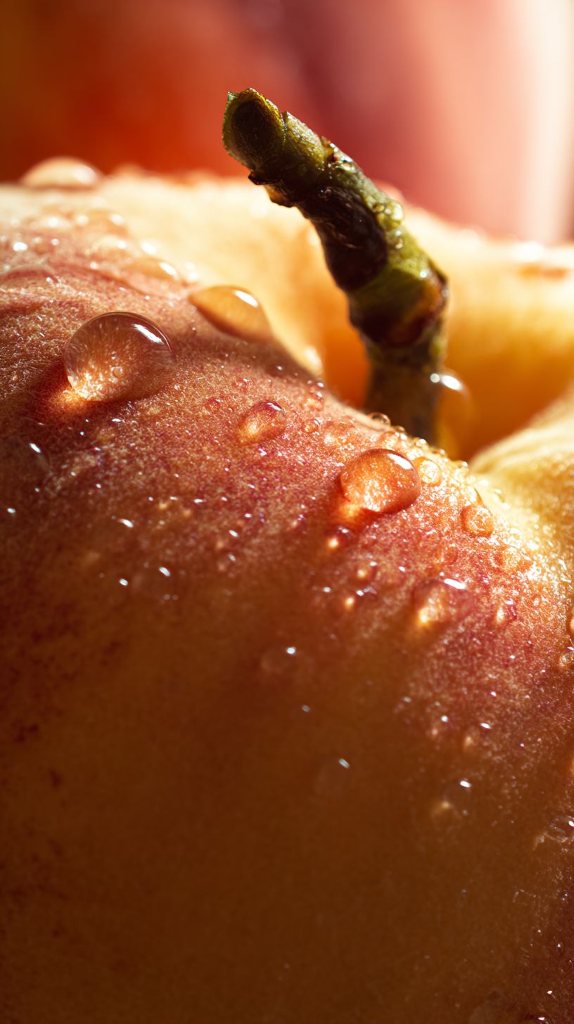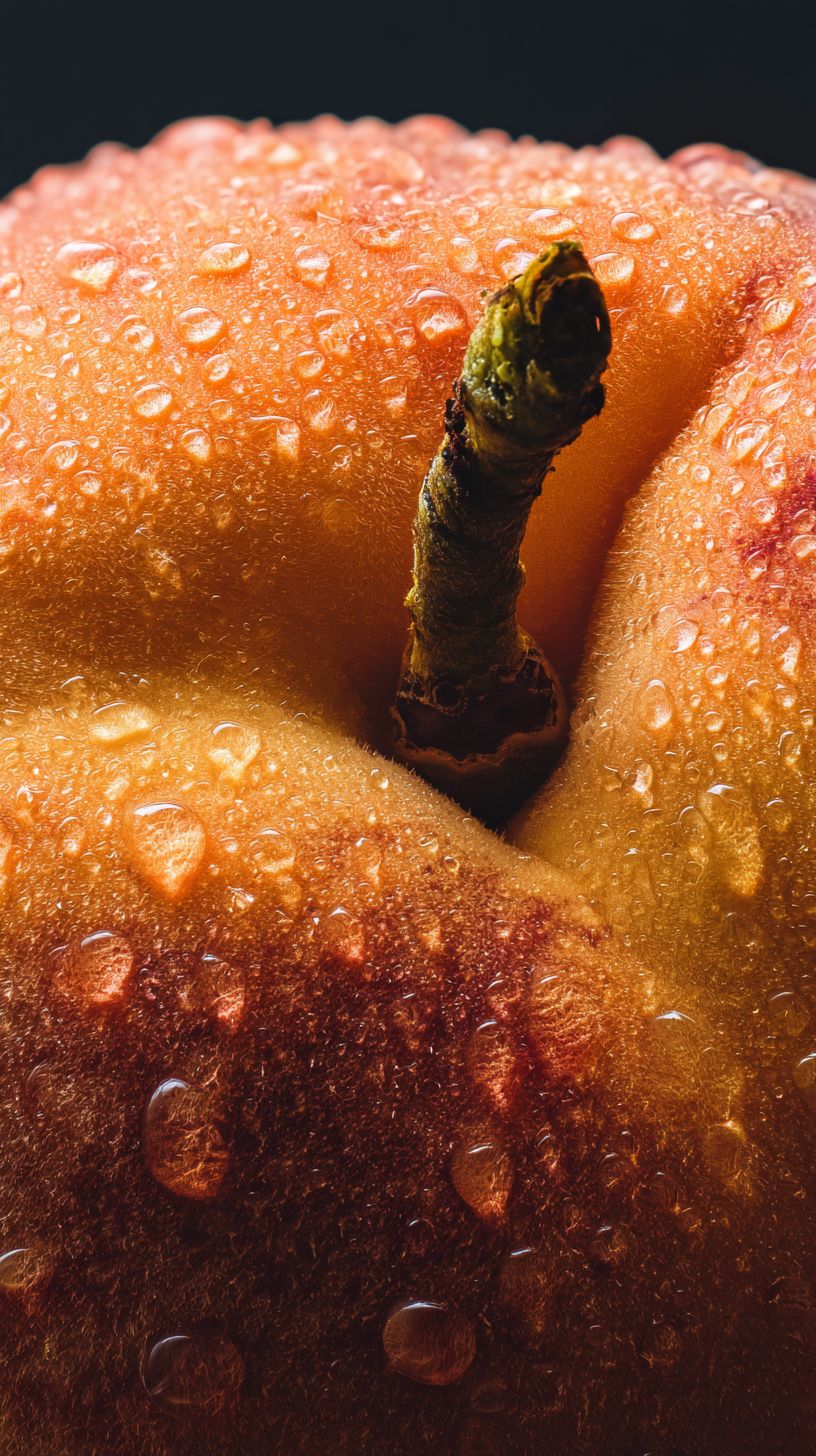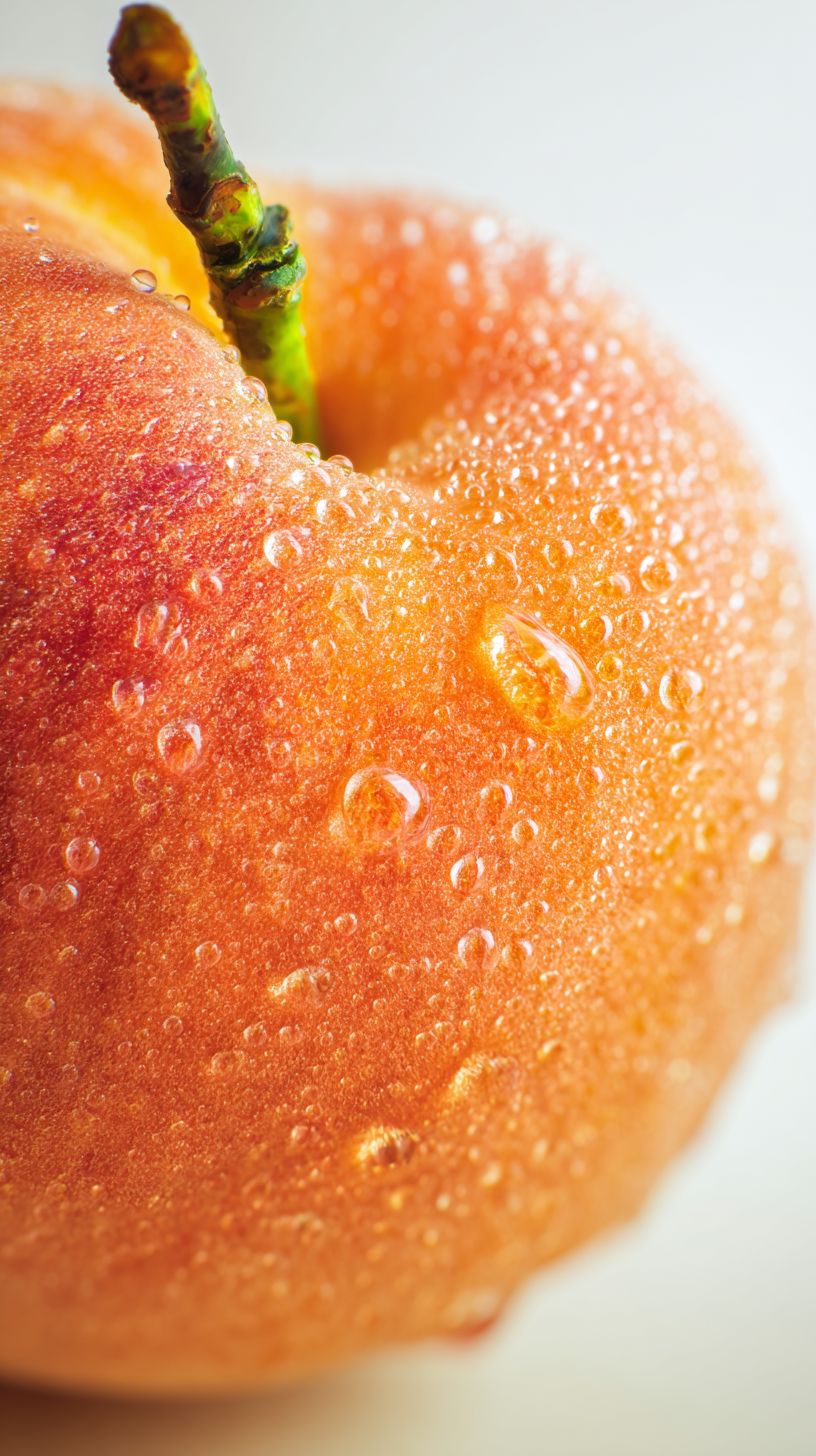 macro close-up of a fresh peach with water droplets on the surface, soft velvety peach skin texture, detailed stem, hyper realistic photography, warm natural lighting, minimal background, high detail, ultra sharp focus --ar 9:16 --stylize 0