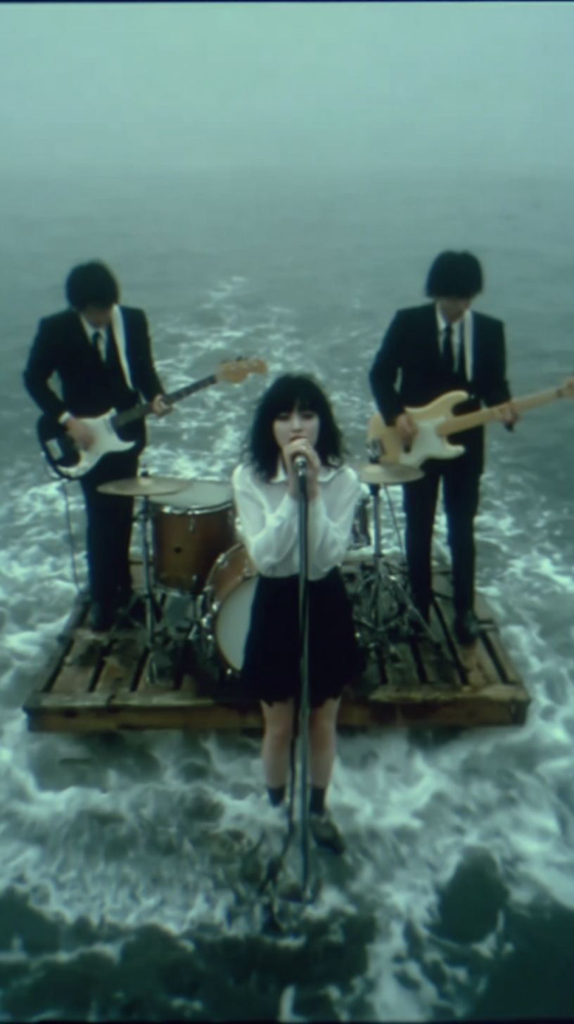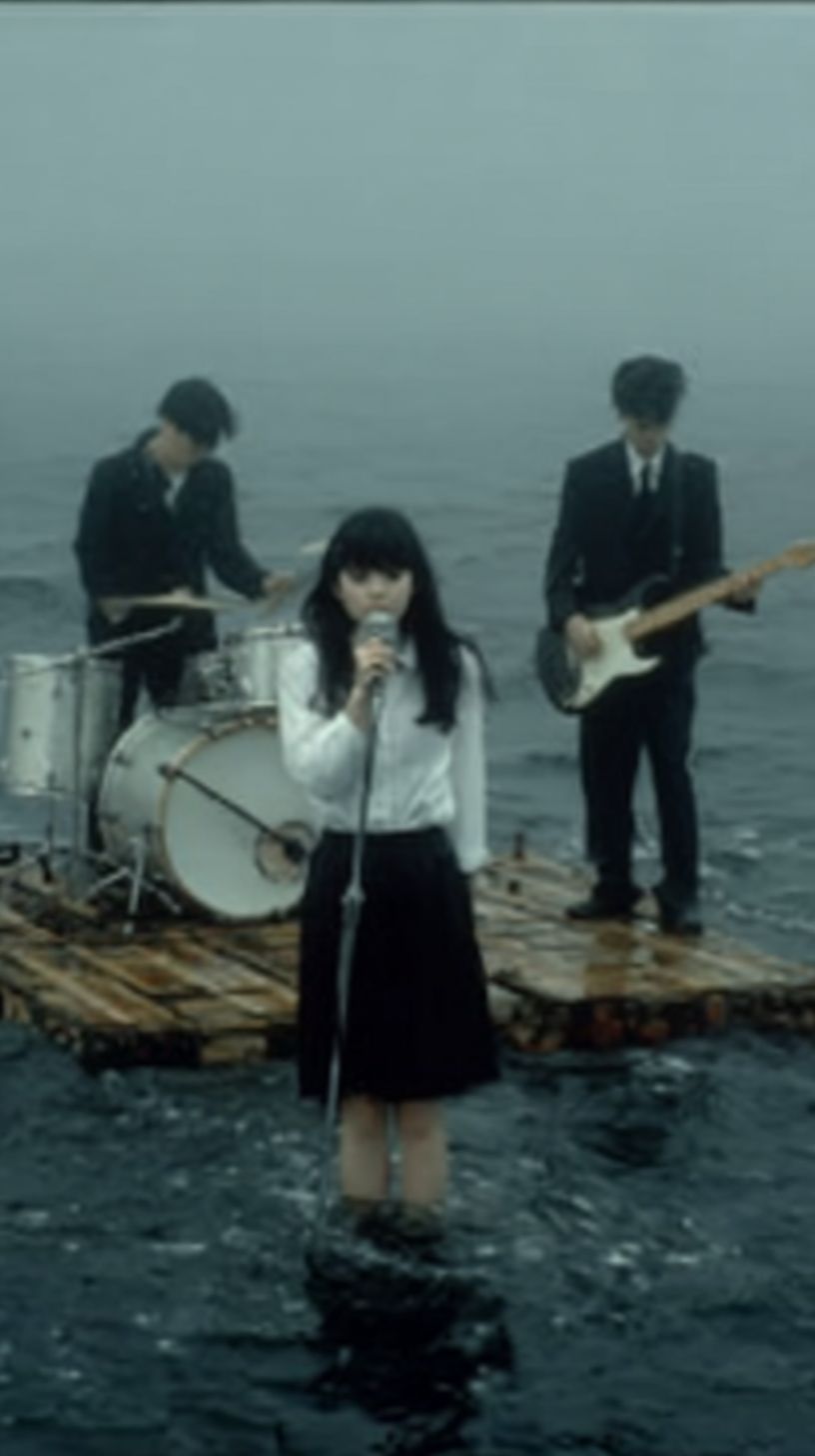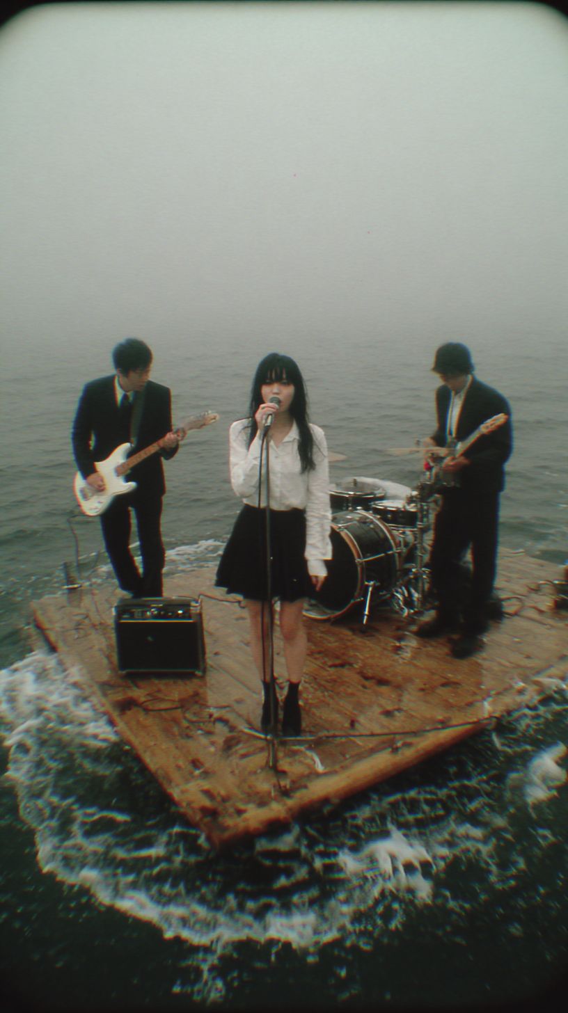 一张早期互联网音乐视频的截图。三位年轻的日本摇滚音乐家在海洋中表演,站在一个小木平台上,四周被无尽的雾霭波浪包围。一位女性,长发披肩,额前有刘海,浓密的睫毛,穿着白色衬衫和黑色裙子,正对着老式麦克风唱歌。另一位穿着黑色西装的男性,正在弹奏电吉他,水滴在琴弦上闪闪发光。第三位则在平台上不稳定的地方打鼓,每一次击打都溅起水花。这个场景捕捉了90年代的原始美学,颗粒感的VHS纹理,柔和的色调以及一种超现实的梦幻氛围,海洋向迷雾无尽延展。