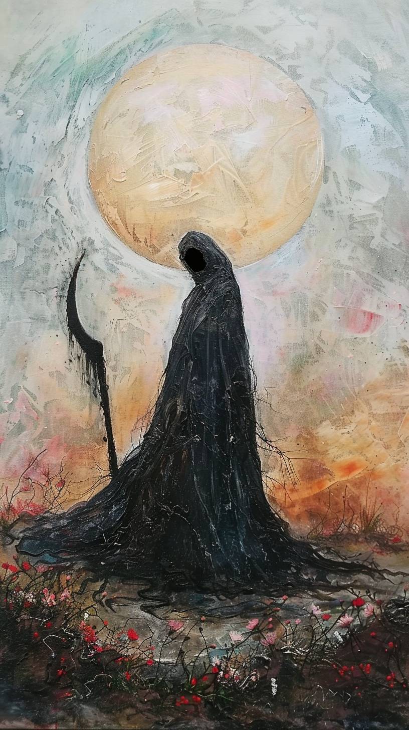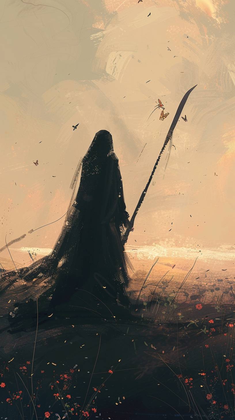 一幅极简主义画作,描绘了一位身披黑袍、手握镰刀的宁静而强大的身影,象征着生命与死亡的循环。