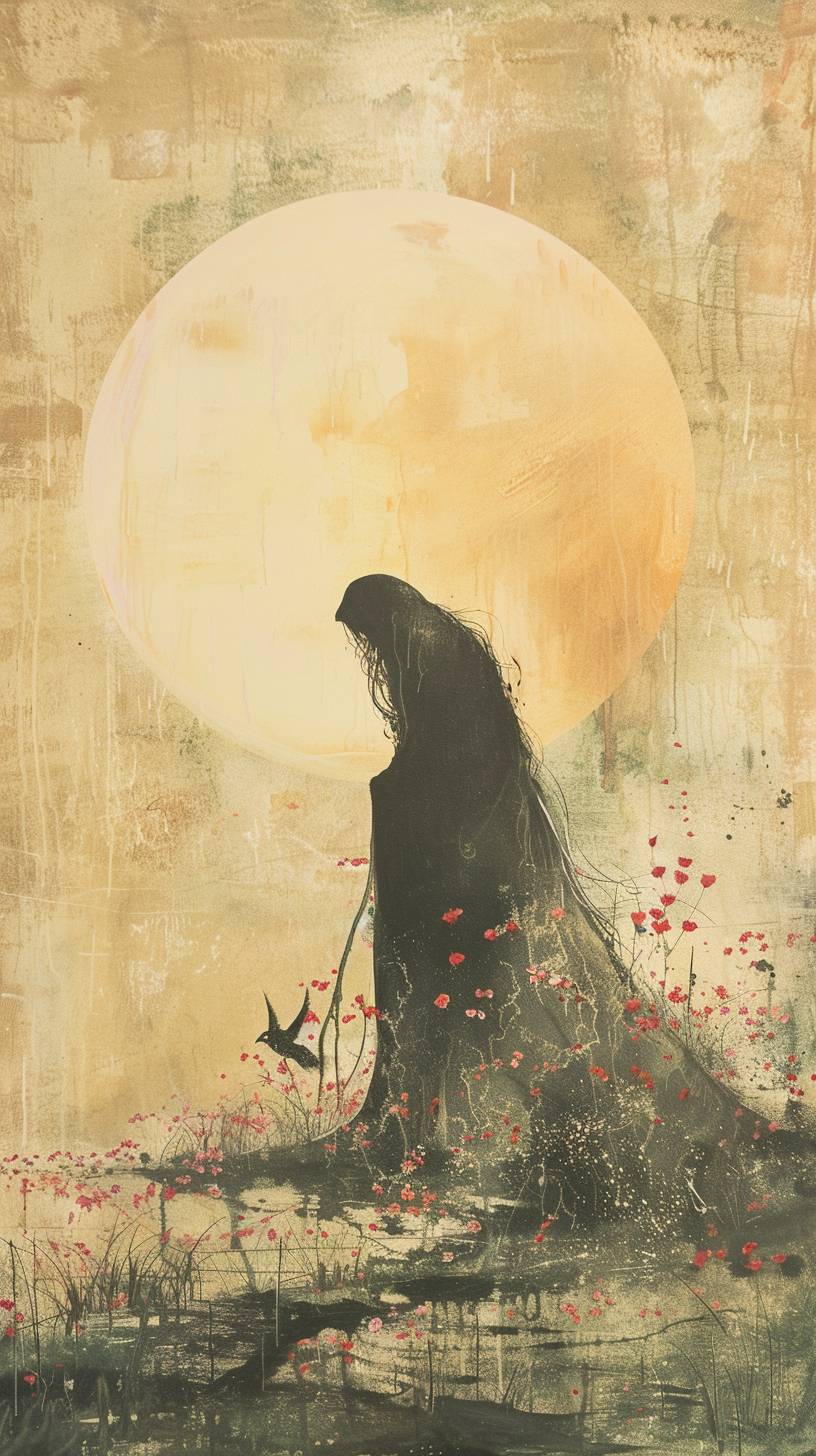 一幅简约主义的画作,描绘了一个宁静而又强大的黑衣人影,手握镰刀。她站在一片荒凉的土地上,旧日的残骸散落一地,象征着一个周期的结束。在远处,黎明的第一缕阳光照亮了地平线,象征着重生和复兴。一只凤凰从灰烬中升起,体现了转变的主题以及生与死的循环性质。花朵在凤凰周围盛开,代表着从结束中孕育的新开始。