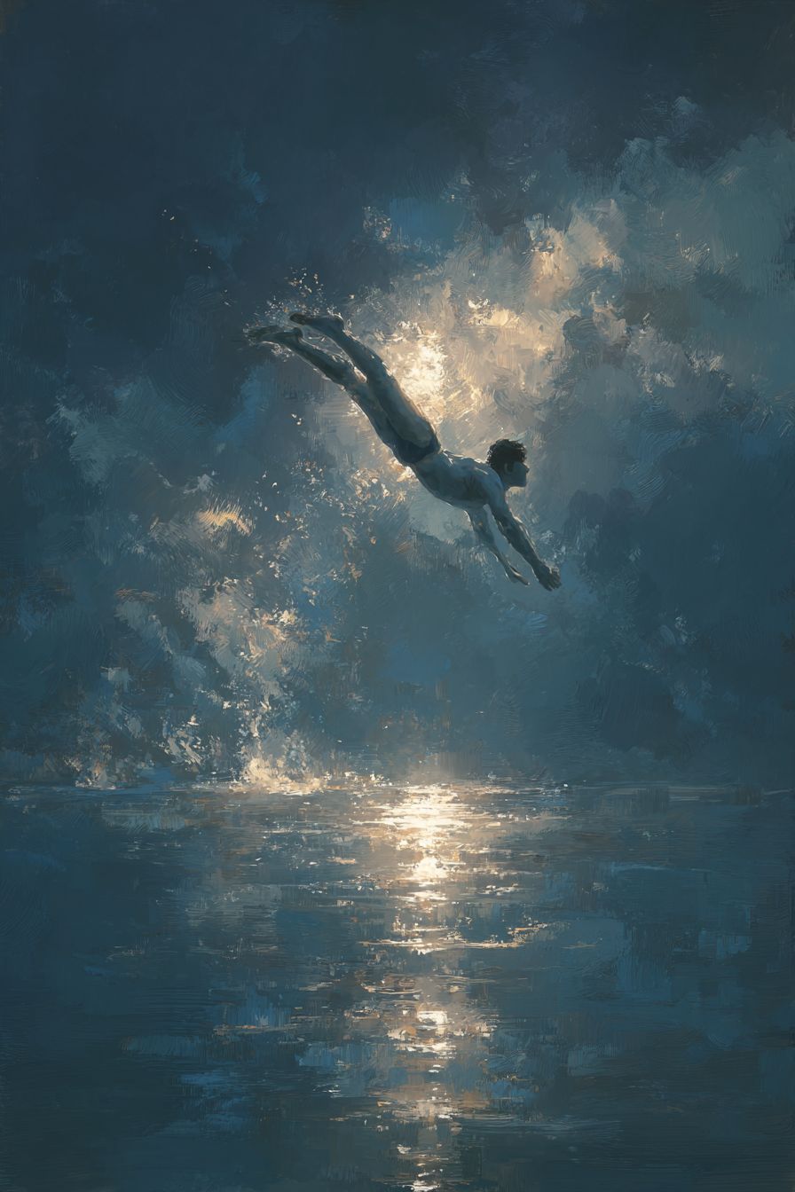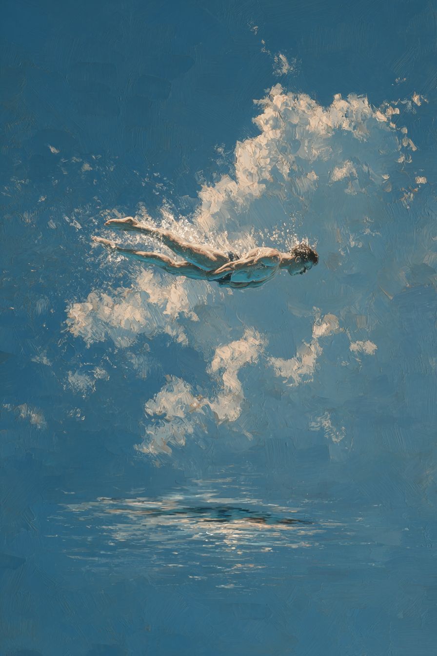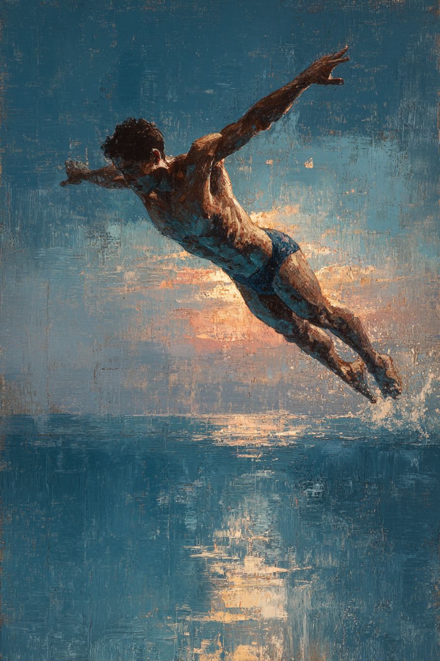 A diver mid-flight above a calm water surface, body in perfect form, evening sky behind, tranquil mood, painterly oil brush strokes, minimal splash below --ar 2:3 --exp 10 --v 7.0