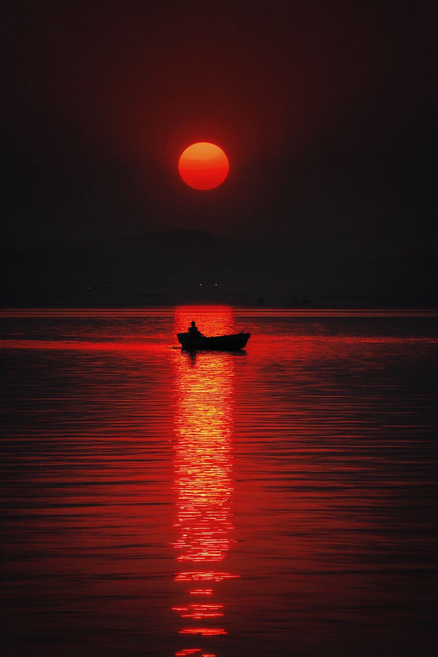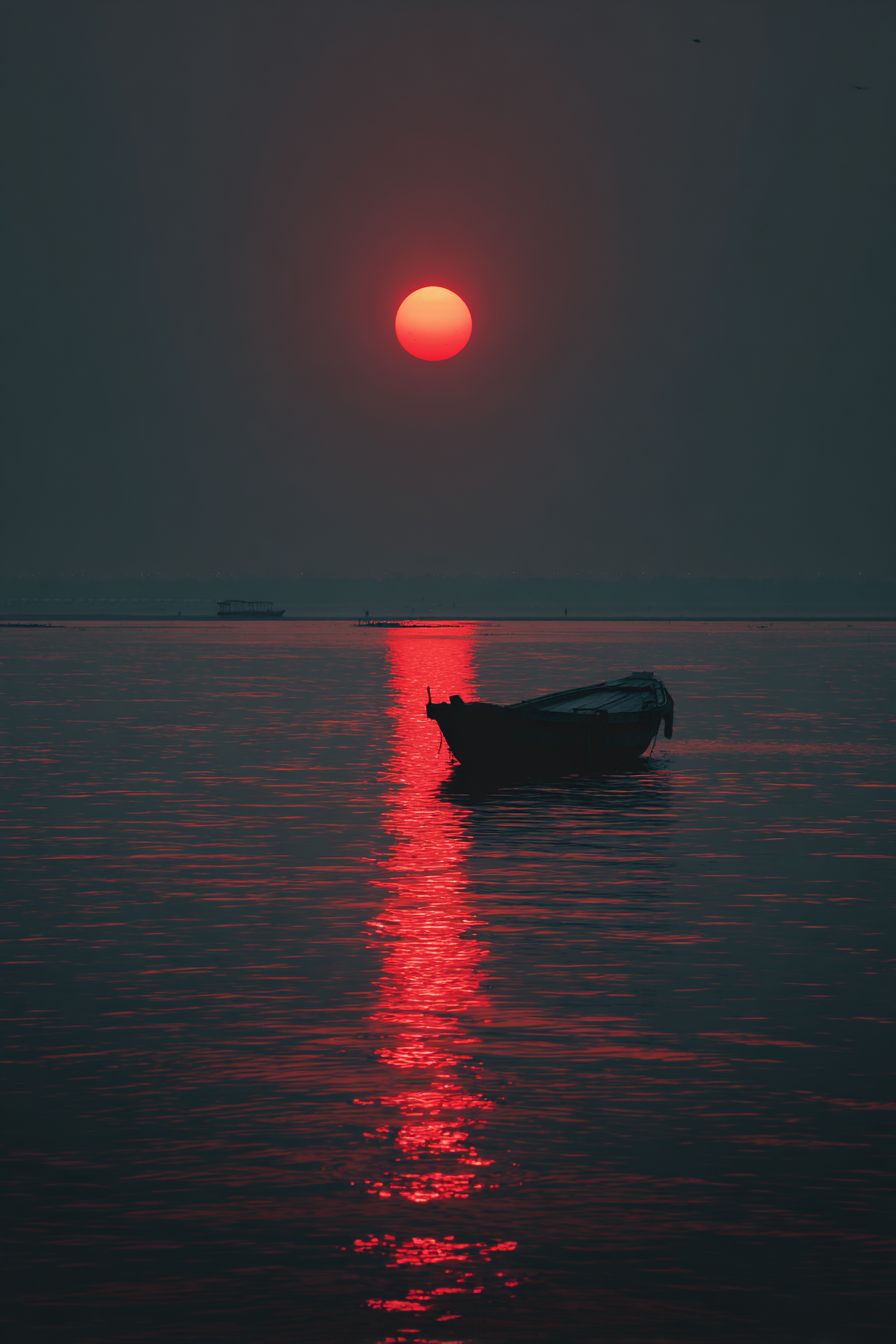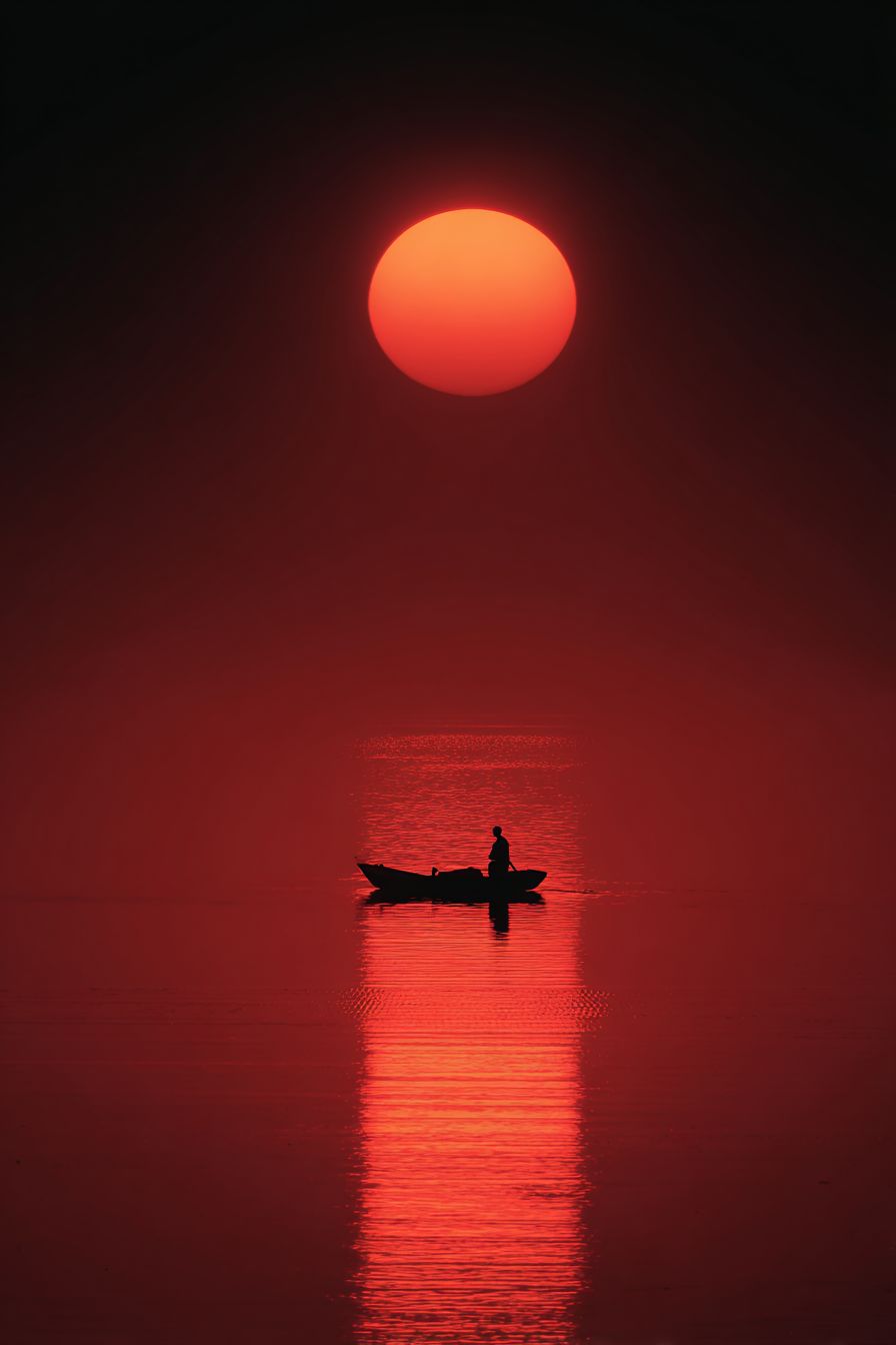 一个红色的太阳在落下,映照在水面上。一只小船漂浮在它面前。背景颜色以黑色为主调,营造出一种充满神秘和宁静的氛围。