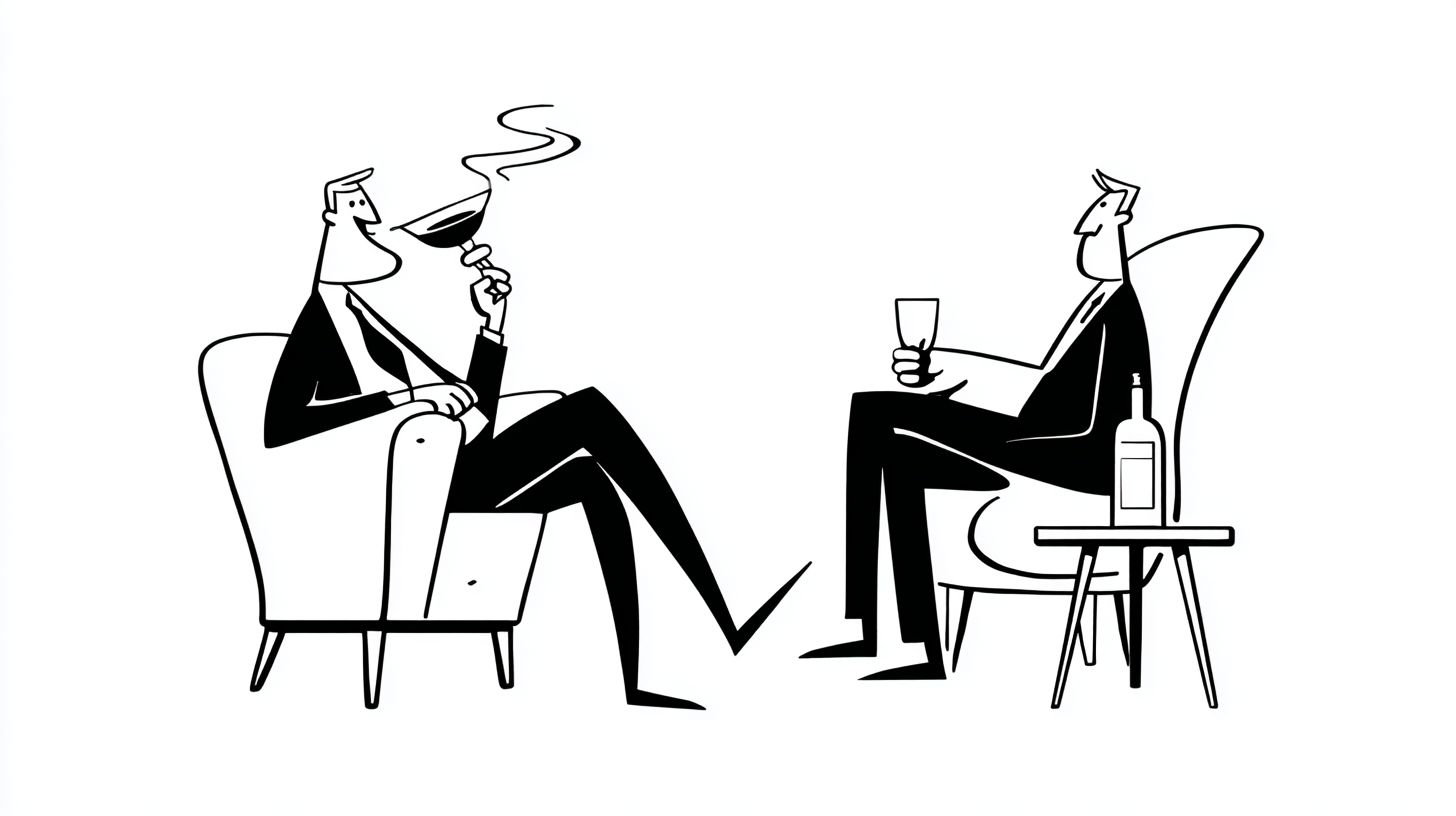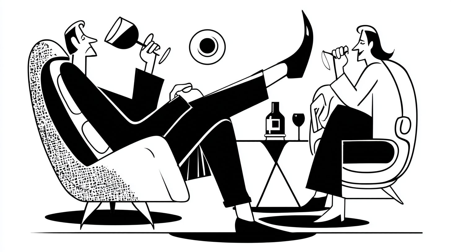 一幅黑白矢量插图,描绘一个坐在俱乐部椅上品酒的人物,旁边有另一人