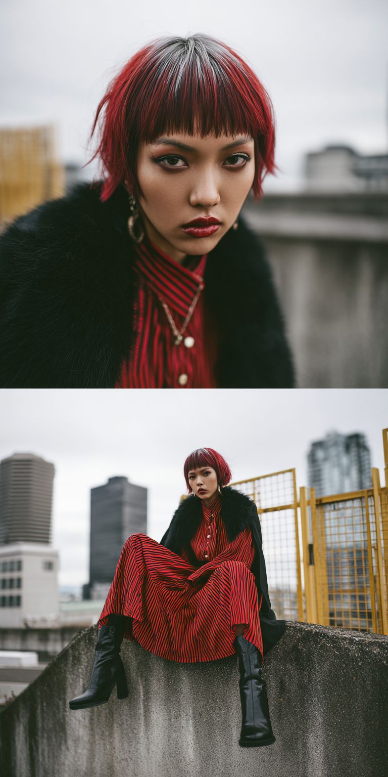 A striking young Indonesian woman with a sharp electric red bob and icy silver streaks, intense smoky eye makeup, and a bold red lip, poses boldly on the edge of a brutalist rooftop structure amidst a stark cityscape. She wears a red striped button-down knit dress, slightly open at the hem, paired with shiny black knee-high boots and a black faux fur coat draped over her shoulders. Her expression is fierce and confident, staring directly into the camera. A gloomy, overcast sky, cinematic lighting with soft shadows and cool tones, shallow depth of field blurring the modern skyscrapers in the background. A yellow industrial fence frames the scene. Editorial fashion style, highly detailed textures, Vogue magazine aesthetic, 85mm lens look, ultra-realistic, high contrast, cinematic color grading, soft film grain, fashion photography style, rule of thirds composition. --chaos 10 --ar 1:2 --raw