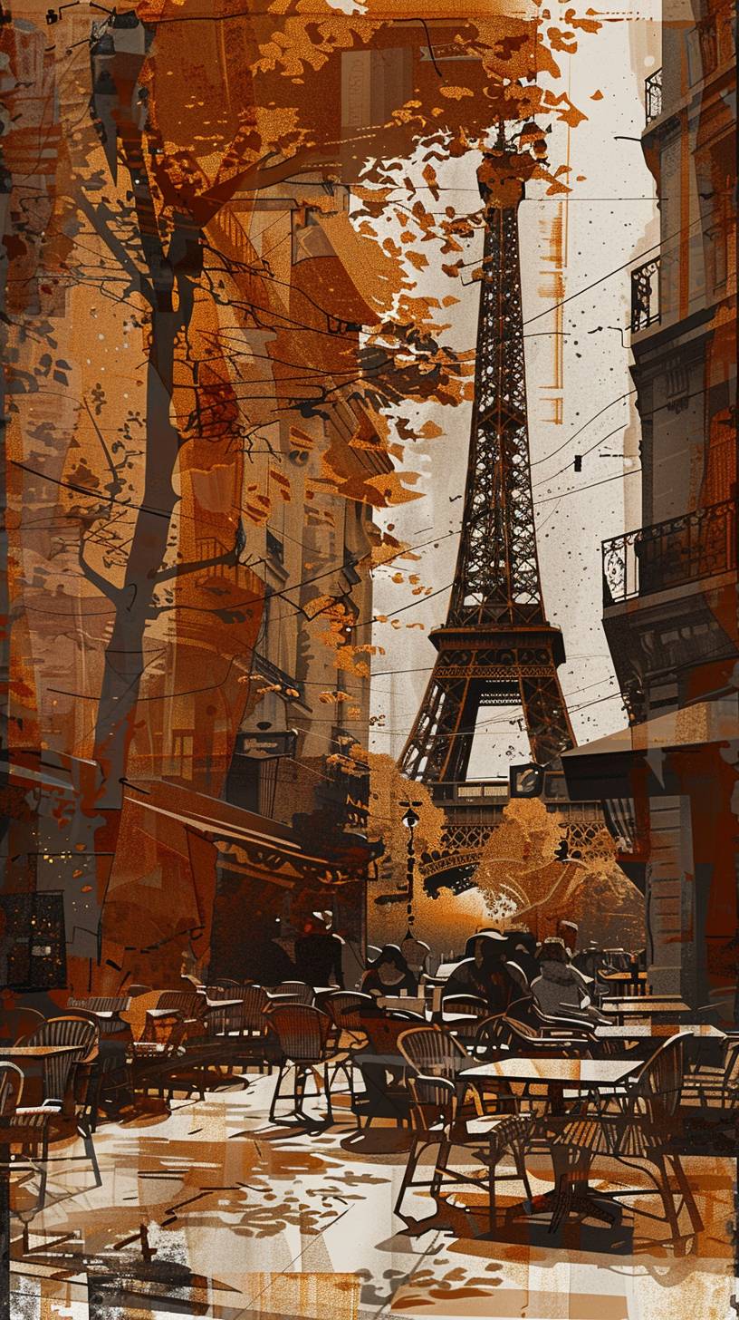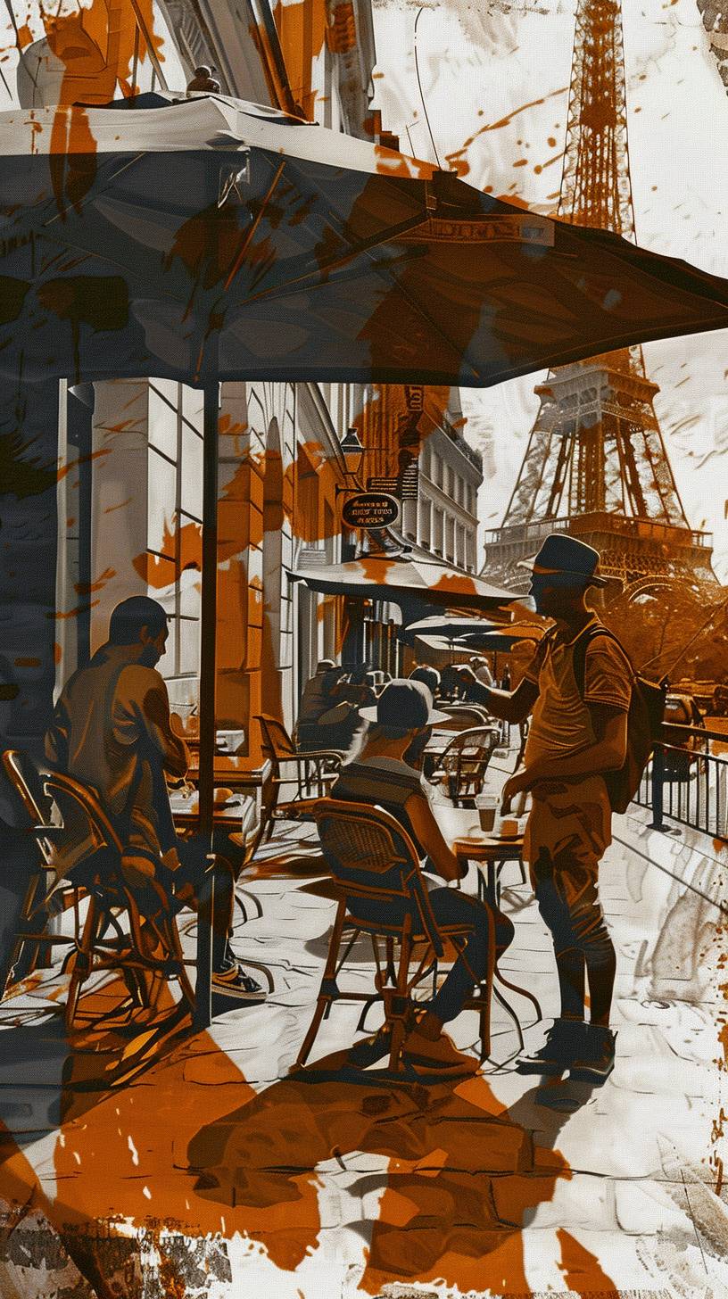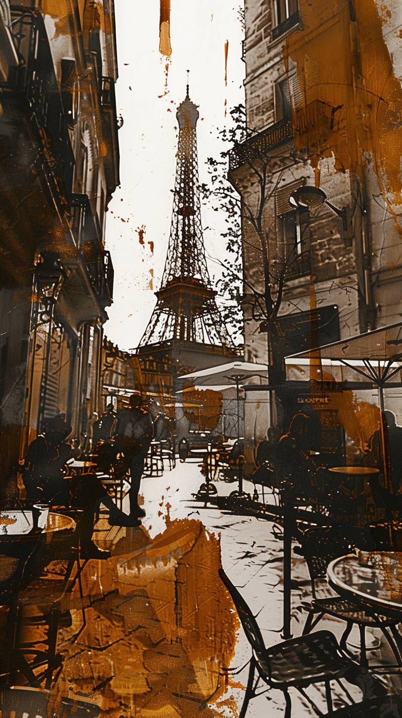 Charming Parisian street café, people enjoying coffee, Eiffel Tower in the background, soft morning light, romantic atmosphere --ar 9:16 --sref 2860279646 --v 6.0