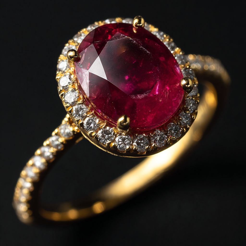 simple 10ct Ruby women's ring, 18k gold, diamond halo, micropave diamond band, on a solid black background, 35mm --v 7.0