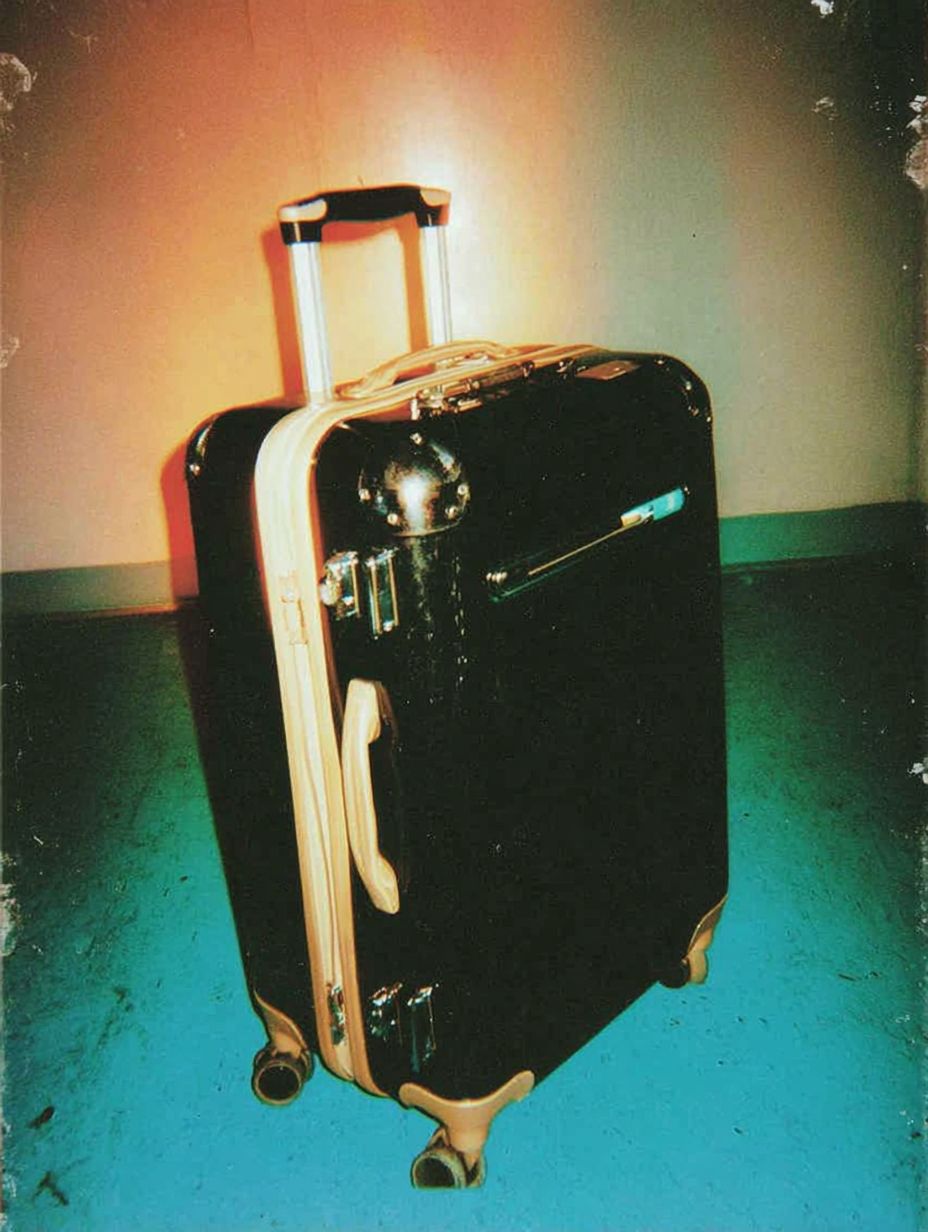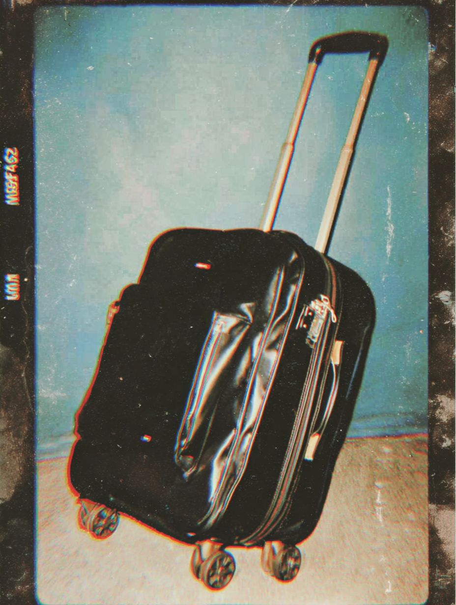 一个扭曲的行李轮廓在柔和的红色双色调光辉中站立,主伸缩手柄完全翻转向外,旋转180度远离主体,形成一个向后延伸的刚性弯曲弧线,像一个过度弯曲的铰链。干净的黑色轮廓带着微妙的红色边缘晕染,柔和的蓝绿色雾气模糊了背景,细节部分消融成色彩模糊,超现实的极简主义带有宁静的紧张感。超重的模拟胶卷颗粒,哑光纹理,尘埃颗粒,微弱的划痕,红色高光上的柔和晕影,先锋的编辑物体研究,保持匿名,没有幻想元素。