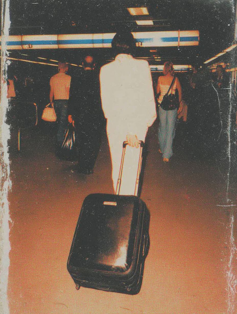 a distorted luggage silhouette standing in soft red duotone glow, the main telescopic handle flipped fully outward, rotated 180 degrees away from the body, forming a rigid curved arc that extends backward like an over-bent hinge. clean black silhouette with subtle red edge bloom, muted teal haze dissolving the background, details partially erased into chromatic blur, surreal minimalism with quiet tension. ultra-heavy analog film grain, matte texture, dust specks, faint scratches, soft halation on the red highlights, avant-garde editorial object study, anonymity preserved, no fantasy elements. --ar 3:4 --profile 715v9xa --v 7.0