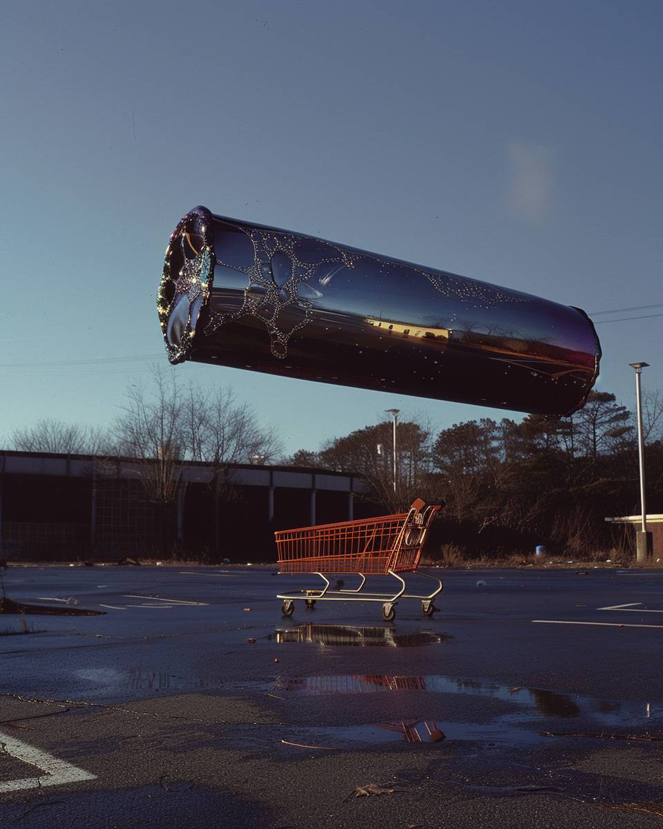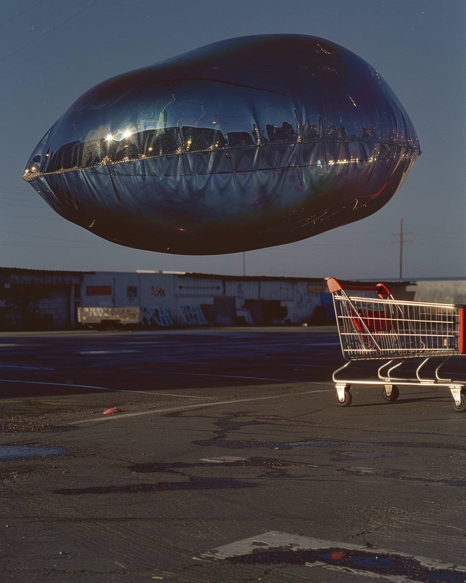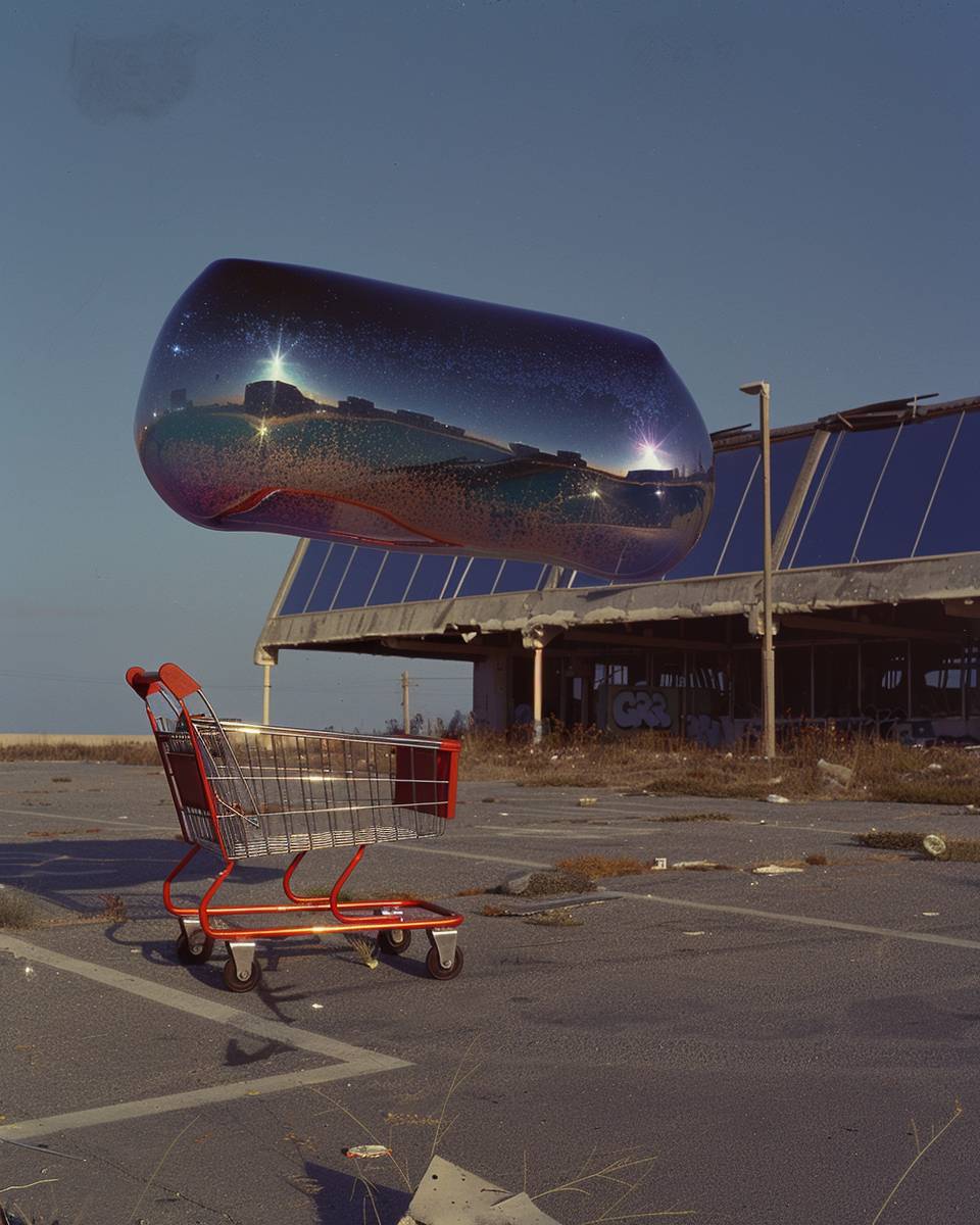 a large iridescent and heterogeneous soap bubble floating through a parking lot above an abandoned red shopping cart, sparkling and glistening in the sun. The bubble is reflecting the world around it as it glistens --ar 4:5 --sref 469710847 --no sphere --v 6.0