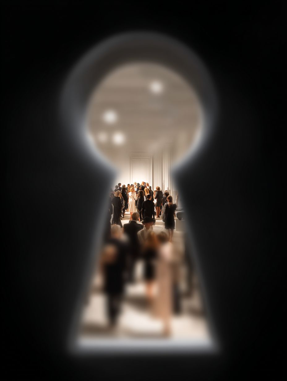 通过钥匙孔看到奢华室内的景象,社交聚会中人们的身影模糊,焦点不在她身上,而是在室内,形成了一种艺术布局和外观,复杂而优雅。背景为黑色,聚焦于钥匙孔中看到的一切。暗到亮的细微渐变增加了深度。柔和的灯光营造出轻柔的阴影,增强了质感细节。