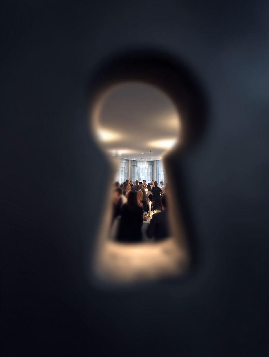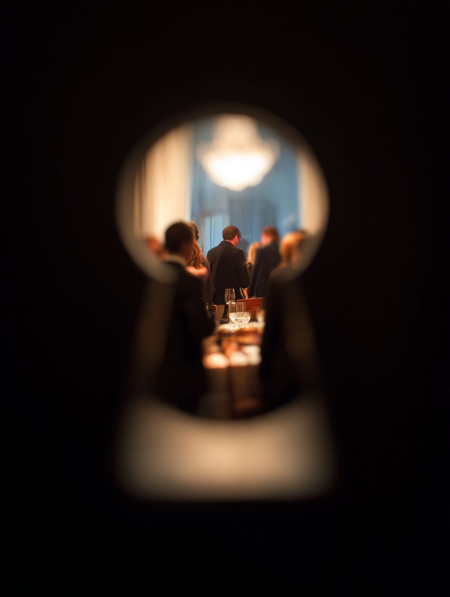 a keyhole view on a luxury interior interior, with a social party society of people, a lit blurred, the focus isnt on her, its on the interior, forming an artistic layout and look and feel. sohpisticated elegant. the background is black, focusing attention on eveyrthing thats seen in the keyhole . there's a subtle gradient from dark to light for depth. soft lighting creates gentle shadows, enhancing texture details. --ar 82:109