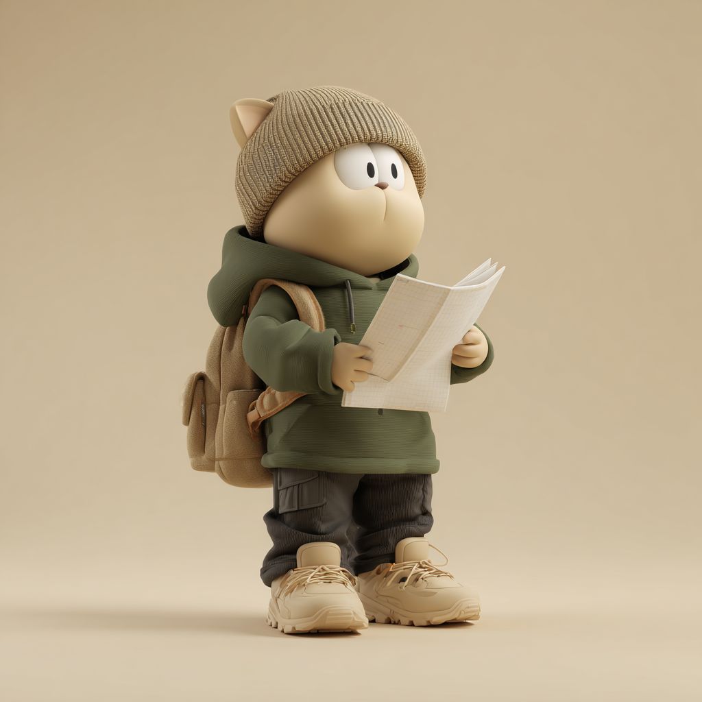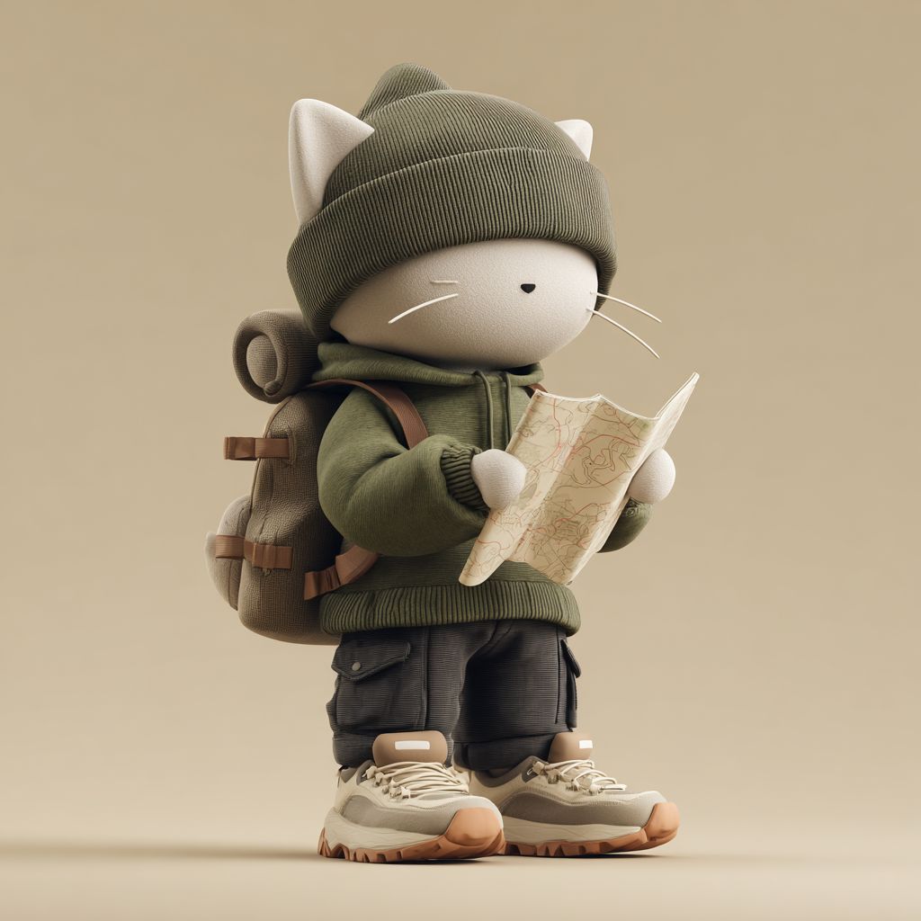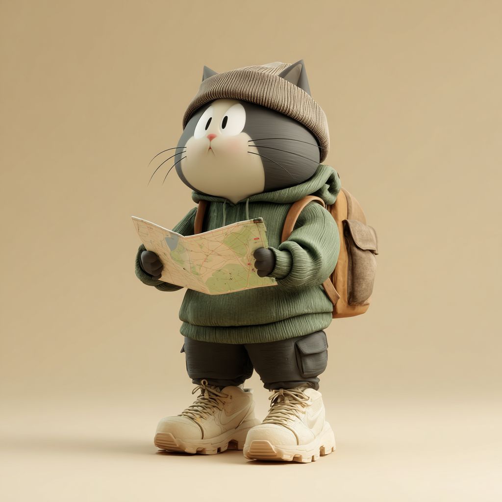 风格化的拟人猫角色,头部大圆、身体紧凑,穿着一件超大号的橄榄绿色连帽衫,深色工装裤,厚重的米色登山鞋,戴着柔软的毛线帽,背后靠着一个中等大小的翻盖背包,直立着用双爪拿着一张摊开的地图,目光向下,带着好奇和思考的表情,简化的风格化几何形状,光滑的哑光纹理,干净的结构,没有额外配件,强烈的轮廓和可见的形状,中性米色背景,专为3D建模和打印设计。